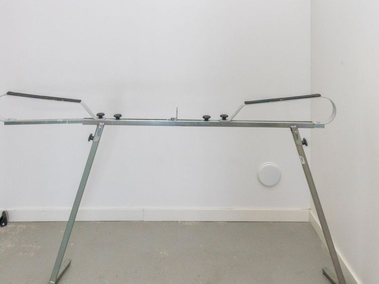 A warm outdoor storage room with ski lubrication rack and iron and storage space.