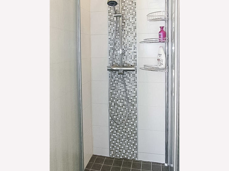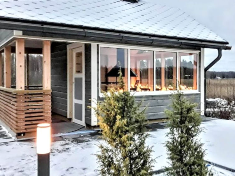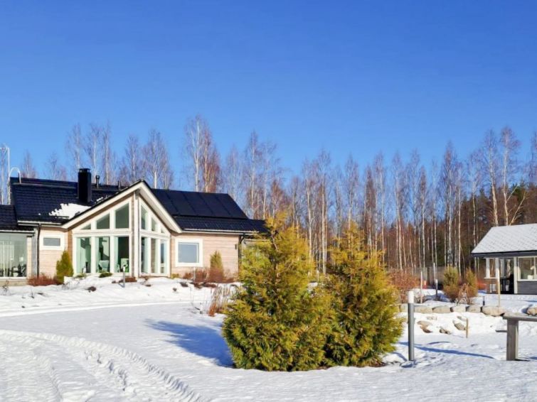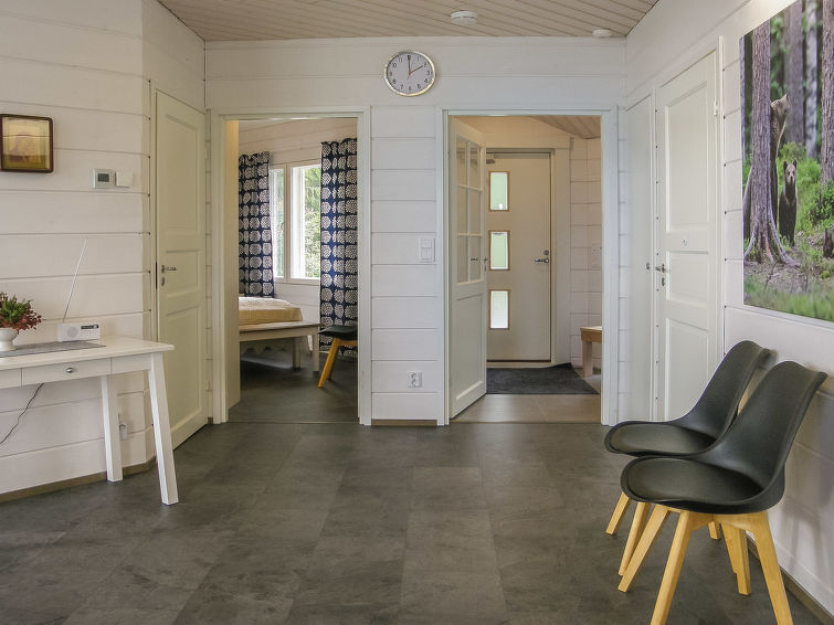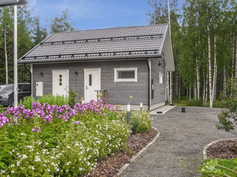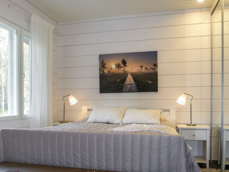 Log cottage, built in 2017, spacious and bright kitchen-living room with convertible sofa for 2, two bedrooms with a double bed in each, a vestibule, wash room with a shower cubicle, wood-heated sauna, entrance to the terrace from wash room and from kitchen.