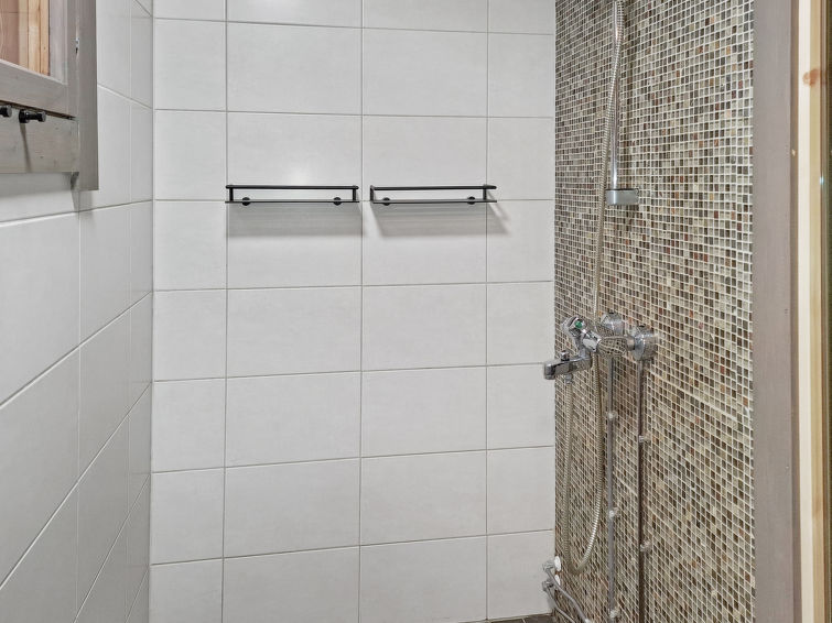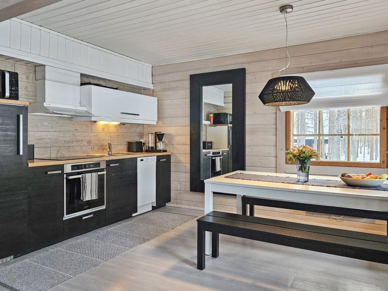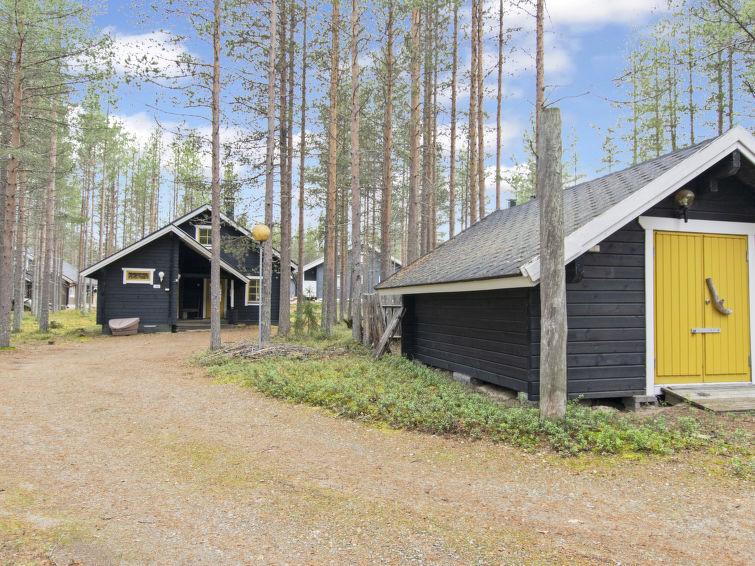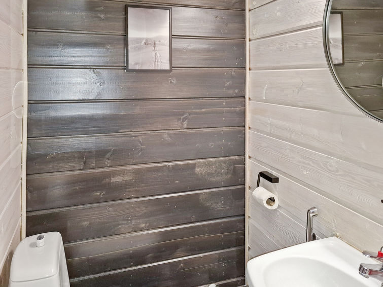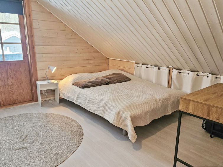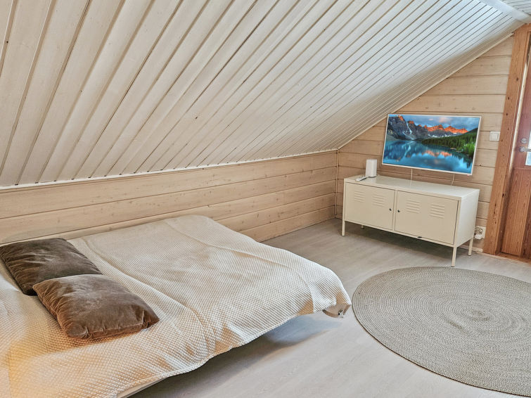 Downstairs kitchen, living room, small bedroom with 160cm wide bed, toilet, bathroom, sauna (electric stove) and terrace. Upstairs bedroom with double bed (160*200cm), loft with two 140cm wide beds. Two TVs in the cabin, one downstairs and one upstairs.