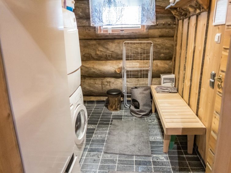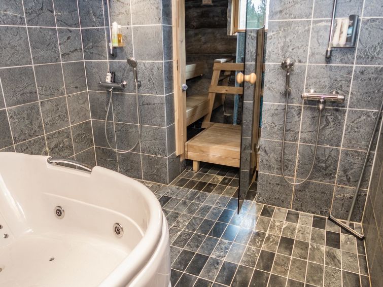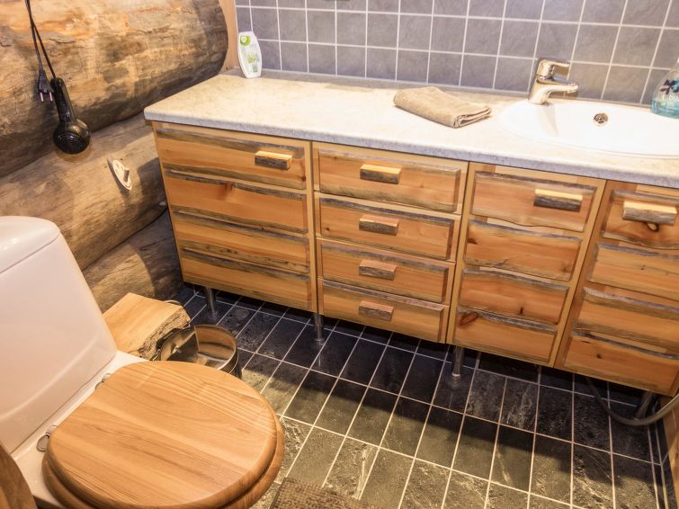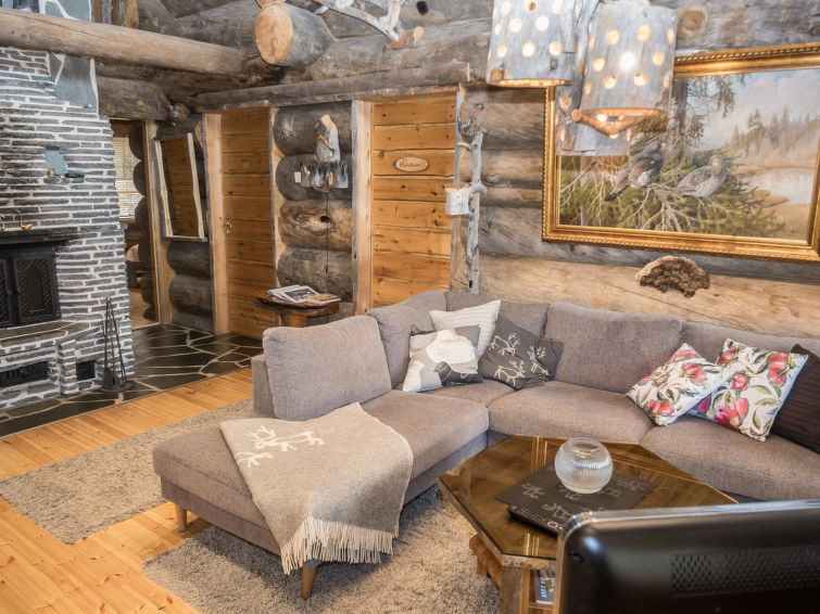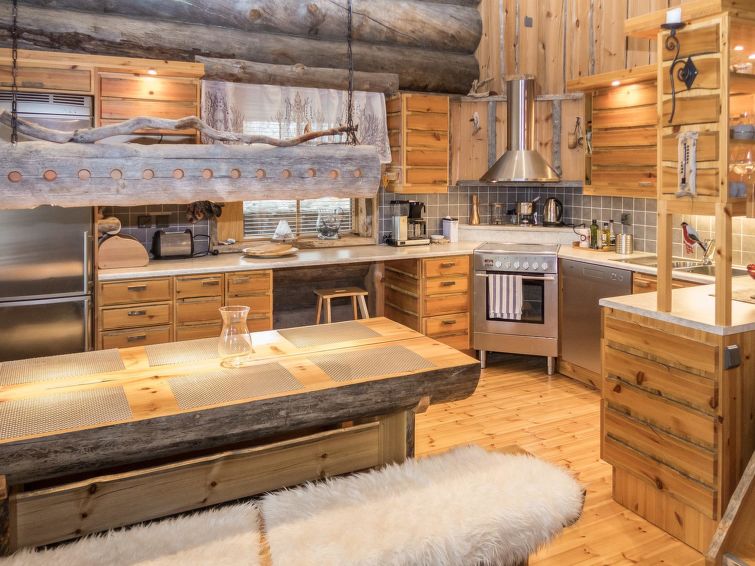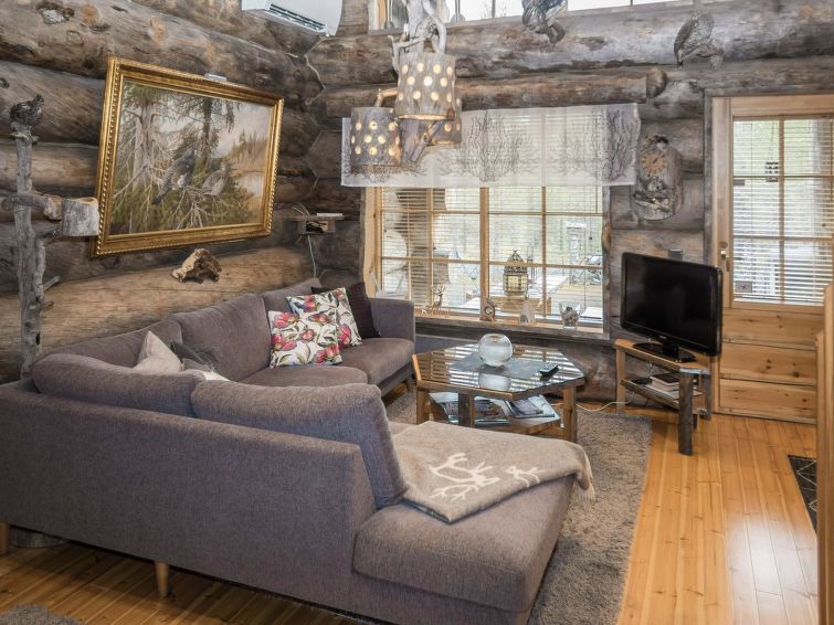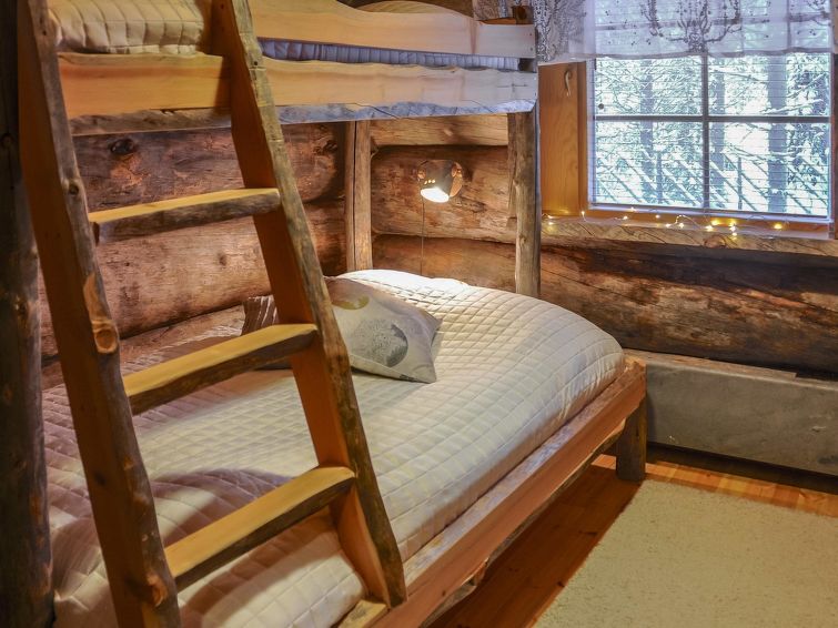 22 km to the north from Kuusamo, Ruka 6 km, lake Iso-Veskajärvi 250 m. Rustic log cabin with loft, built in 2010. Bedroom 1: double bed, bedroom 2: 120 cm bed, bedroom 3: bunk bed (lower bed 120 cm, upper bed 80 cm). Loft: 3 beds. Living room/kitchen, electric sauna, hydro massage bath for two. Exclusive rustic log cabin in the mixed forest nearby lake.