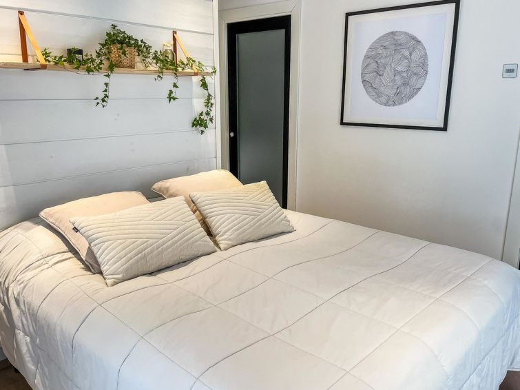 Log villa 2020, large (50 m²) living room/kitchen, two spacious bedrooms, one with double bed, another with two beds, shower and WC in the washroom, covered terrace.