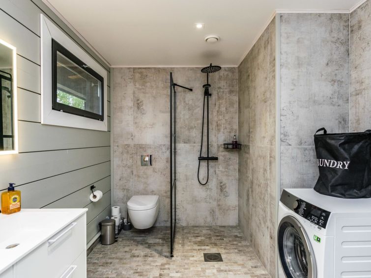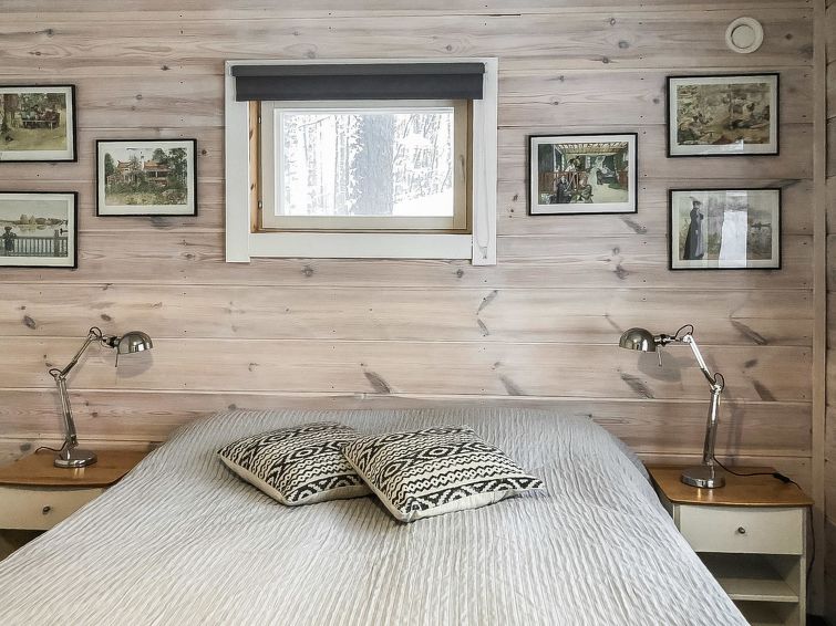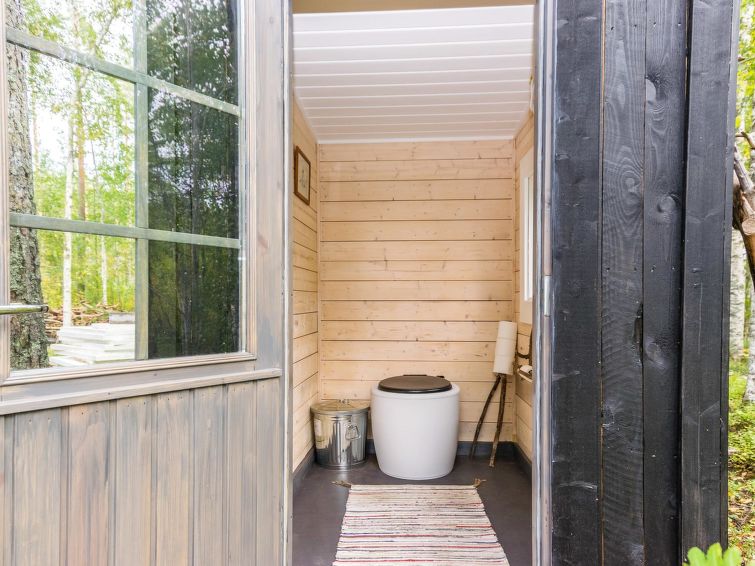 On the beach, there is a sauna building with dressing room, wood-burning sauna stove and large landscape window facing to the lake. Washing water to the sauna comes from a well by pump. Tank in connection with the sauna stove for heating the water.