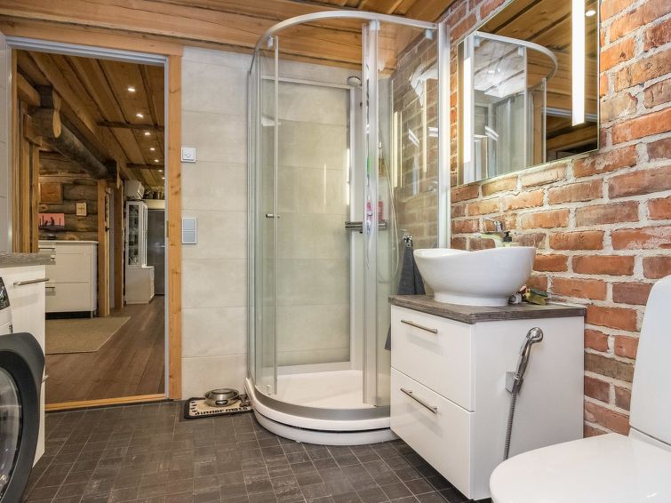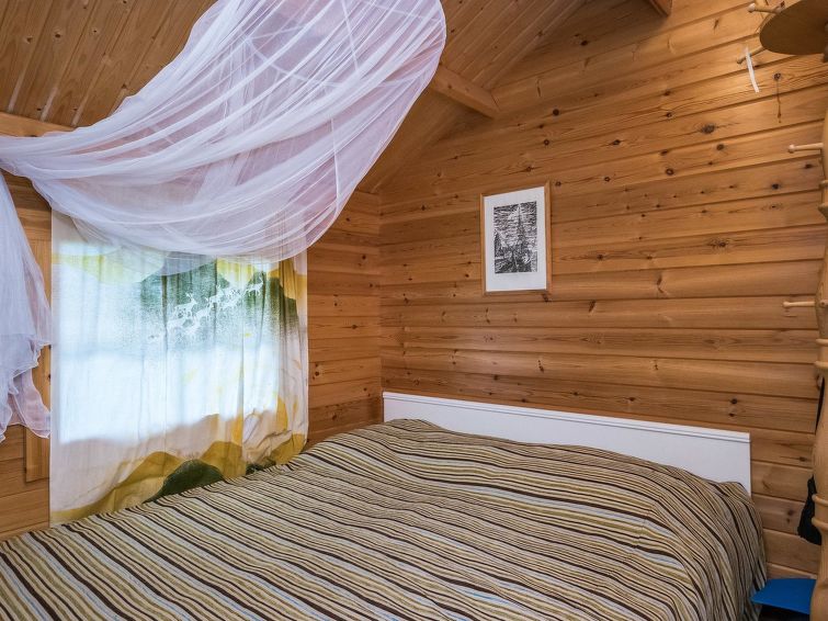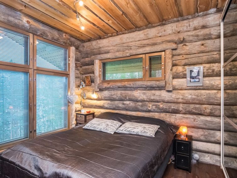 Log cabin 2016, living room/kitchen with sofa bed (130 cm), three bedrooms (10 m²) each with two beds, wide mattress pad for each room (can be used for attaching single beds as a double bed), separate WC, washroom with WC and shower cubicle, no sauna in the cabin.