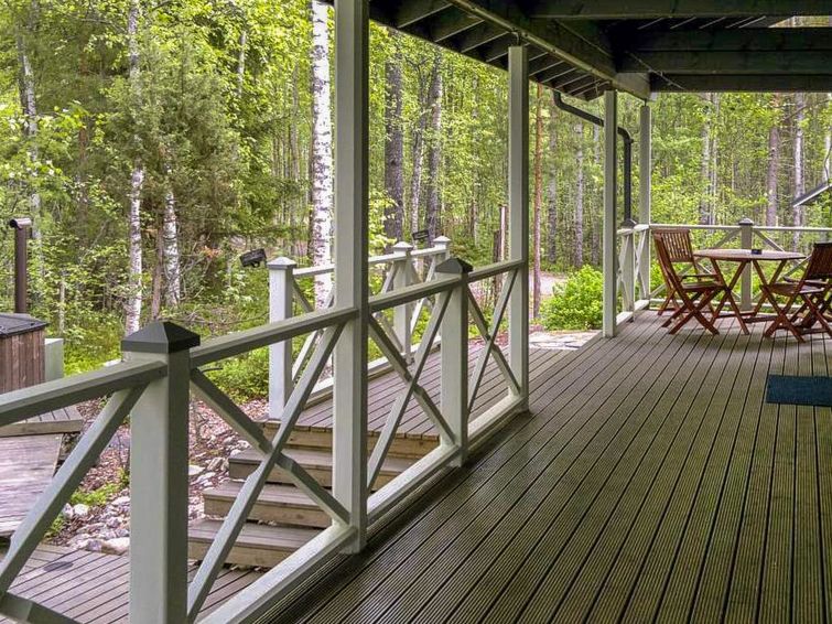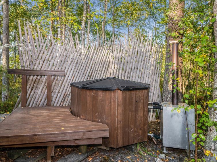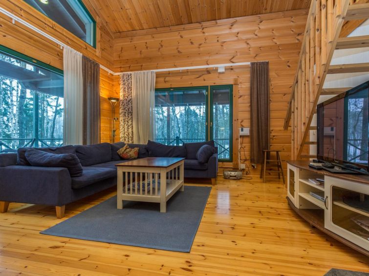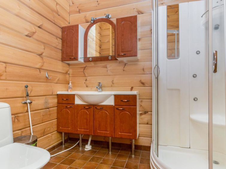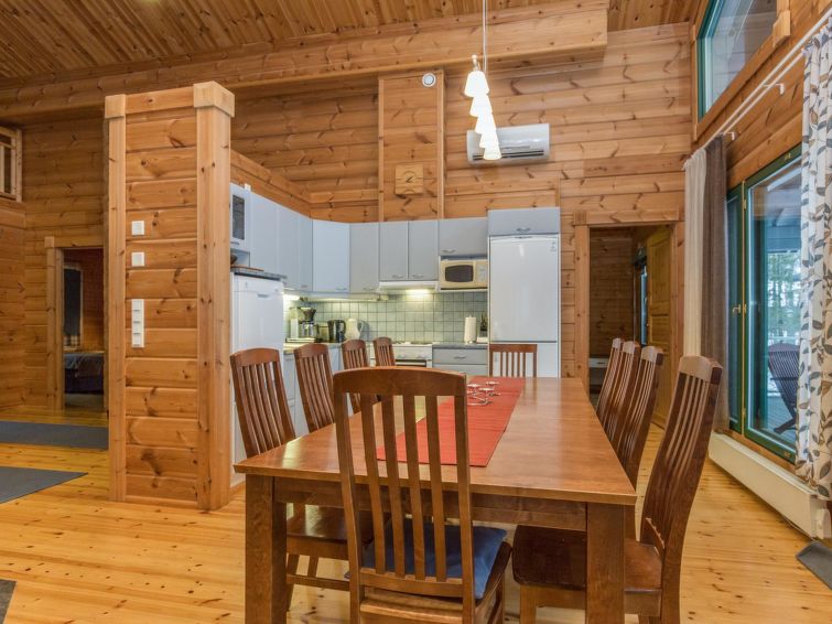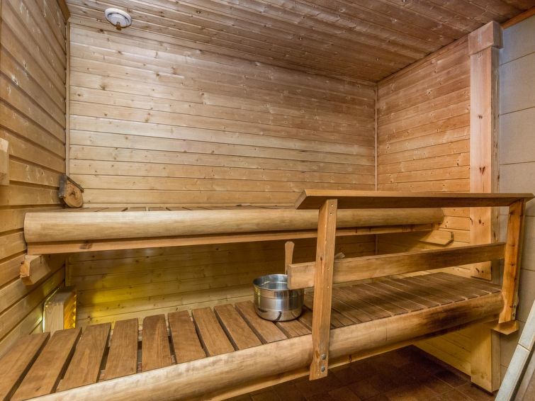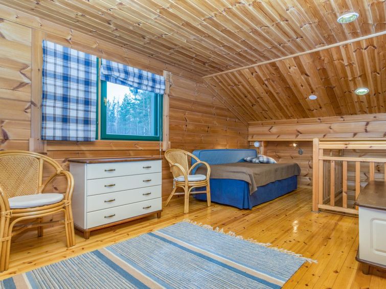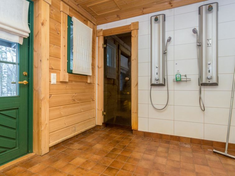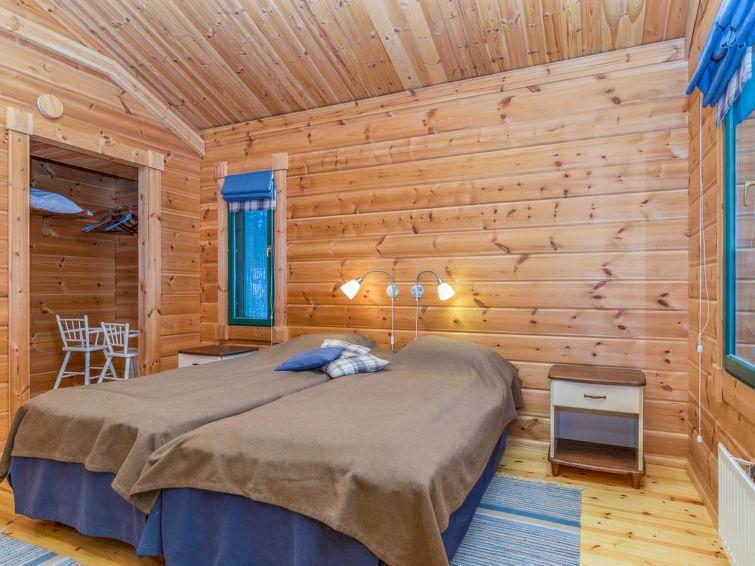 Log villa 2006, living room, kitchen, three bedrooms (11-12 m²), two beds in each, dressing room, washroom, sauna with both electric and wood-burning sauna stove, separate WC.