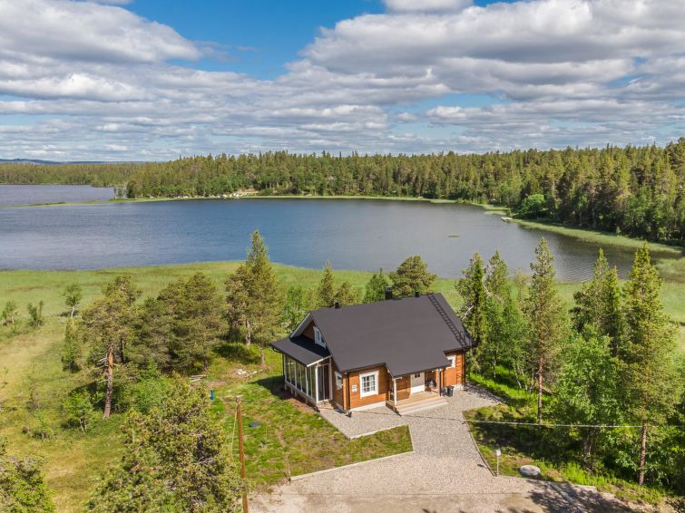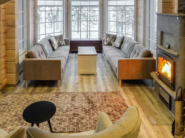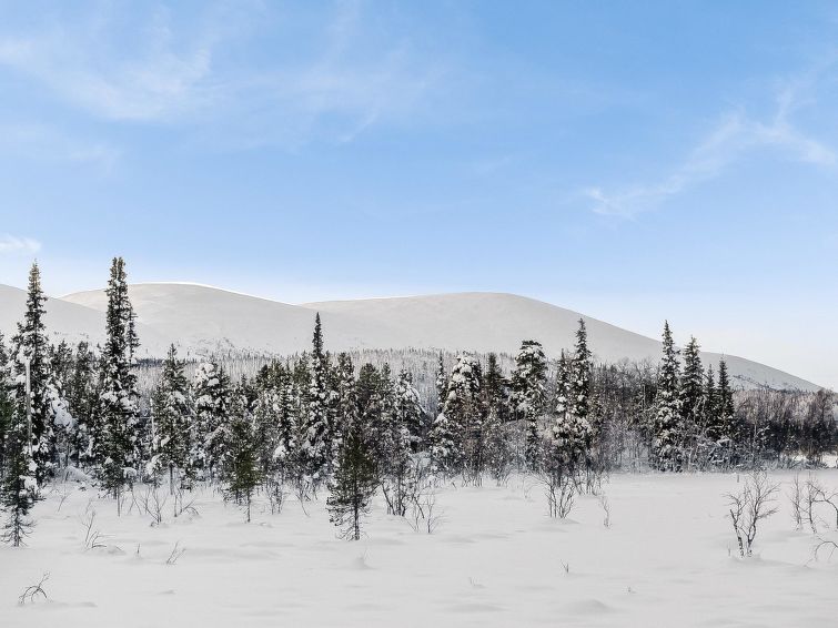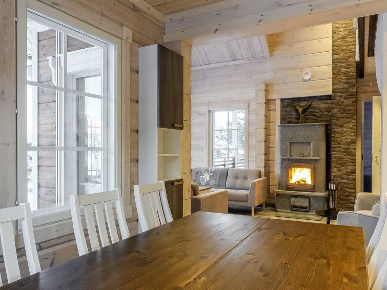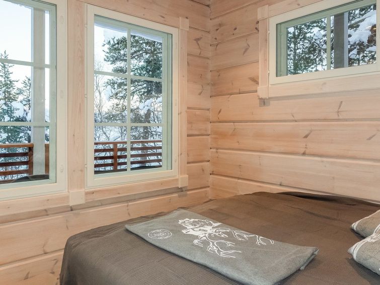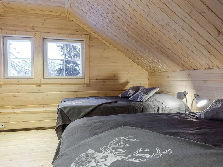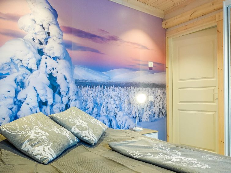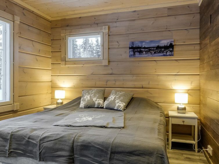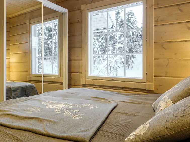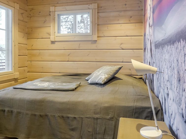 Living room/kitchen, spacious bay window in the living room/kitchen, double bed in the bedroom (width 180 cm), double bed (160 cm) in the another bedroom, 2 beds in the loft (bot are 120 cm wide), sauna, washroom/WC, separate WC and glazed terrace. Villa Tunturisopuli is a spacious and cozy villa by the lake. The plot and the large windows of the villa offer a stunning view of the Pallas fells. Peaceful place at the end of own cabin road.