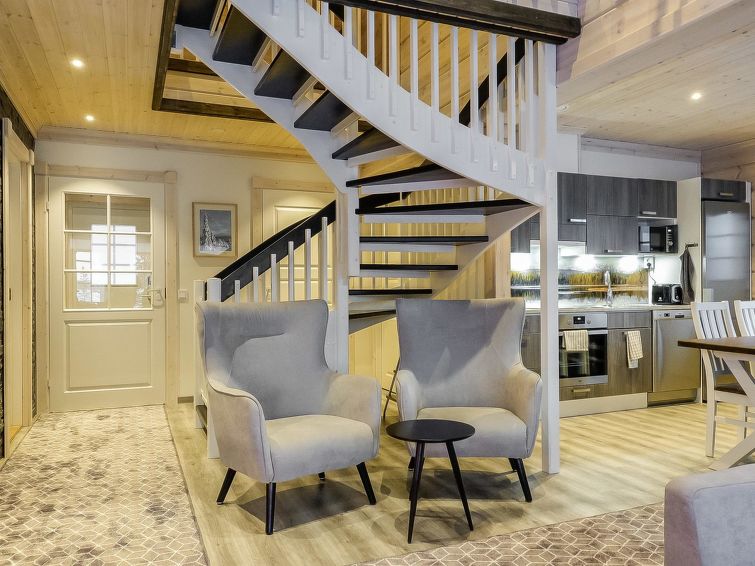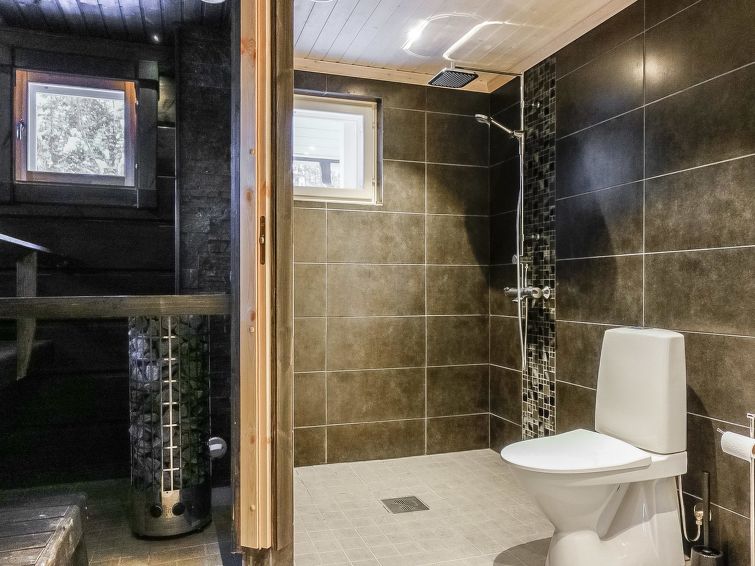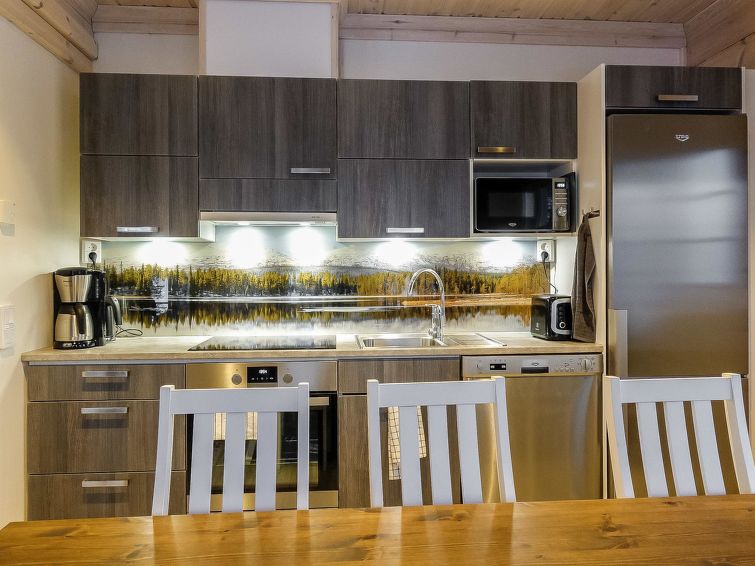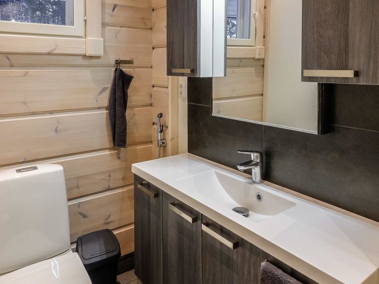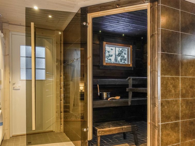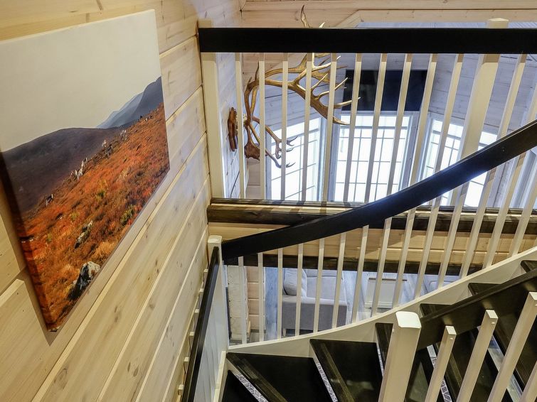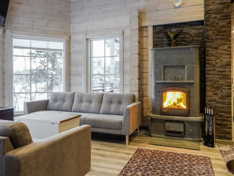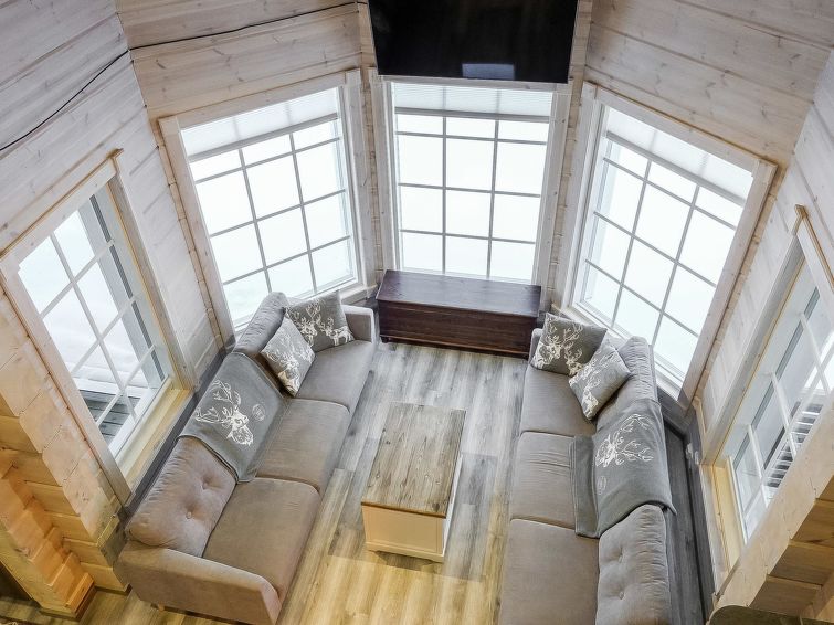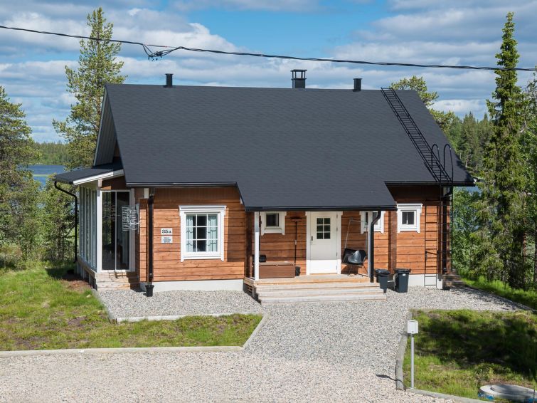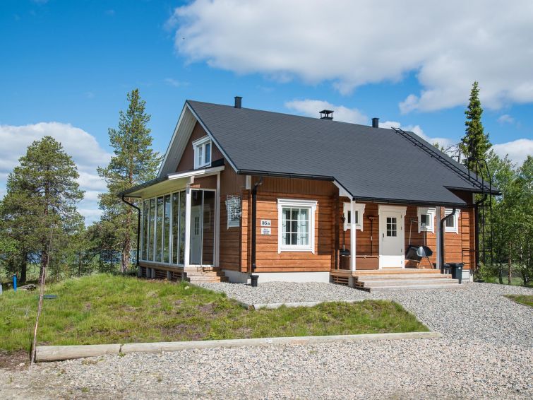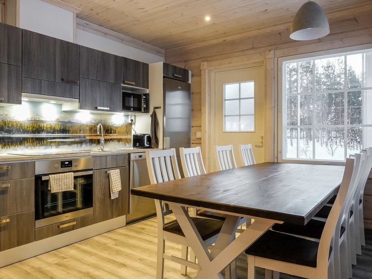 Living room/kitchen, spacious bay window in the living room/kitchen, double bed in the bedroom (width 180 cm), double bed (160 cm) in the another bedroom, 2 beds in the loft (bot are 120 cm wide), sauna, washroom/WC, separate WC and glazed terrace. Villa Tunturisopuli is a spacious and cozy villa by the lake. The plot and the large windows of the villa offer a stunning view of the Pallas fells. Peaceful place at the end of own cabin road.