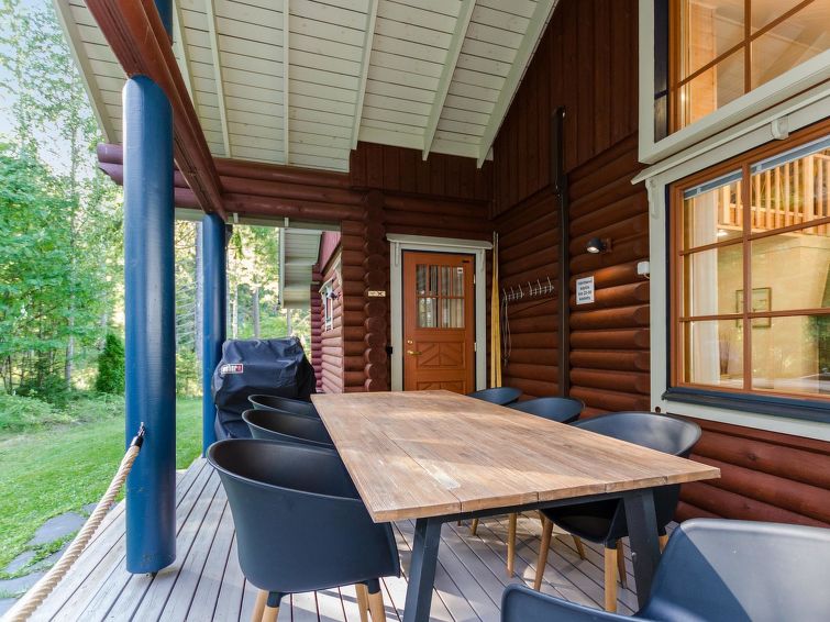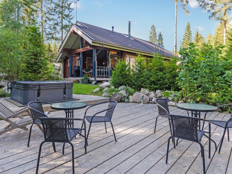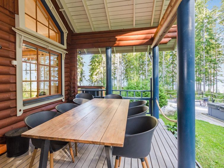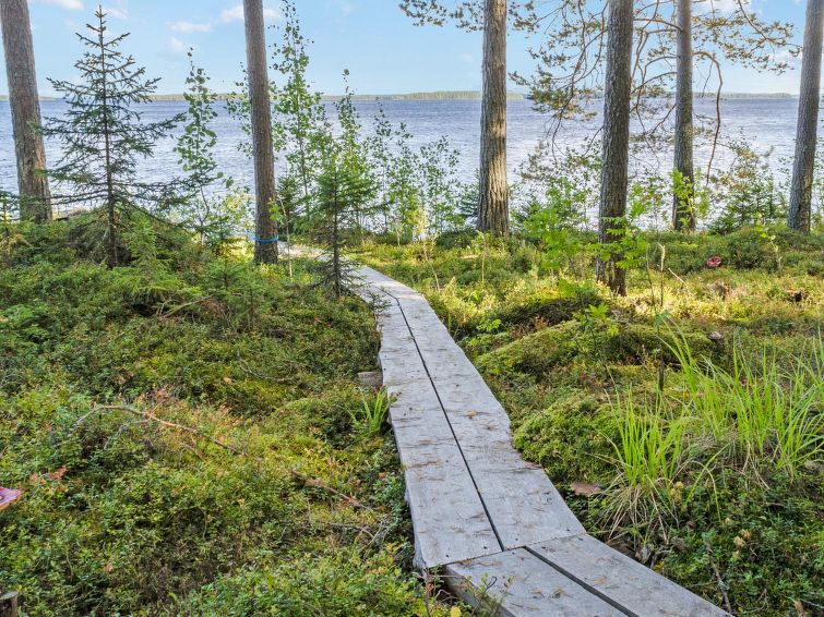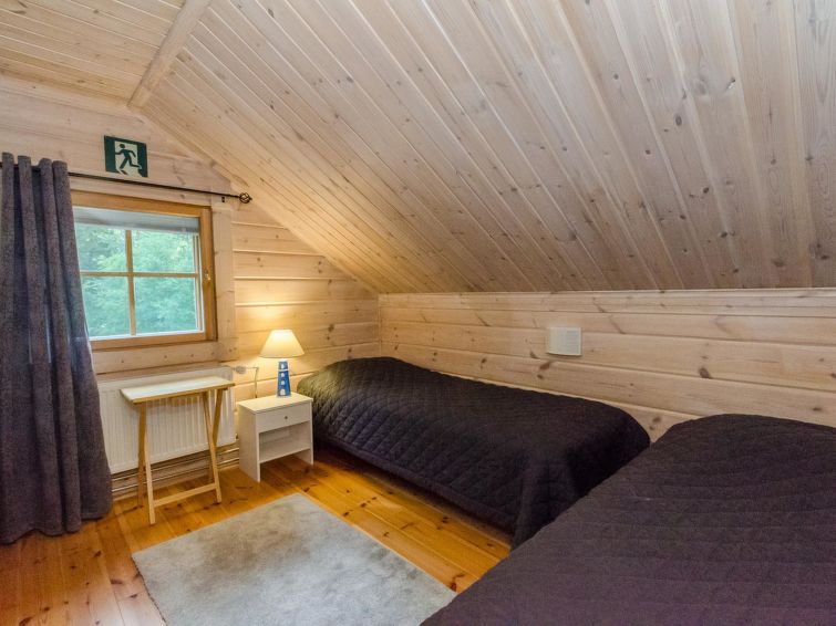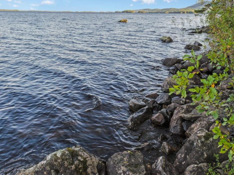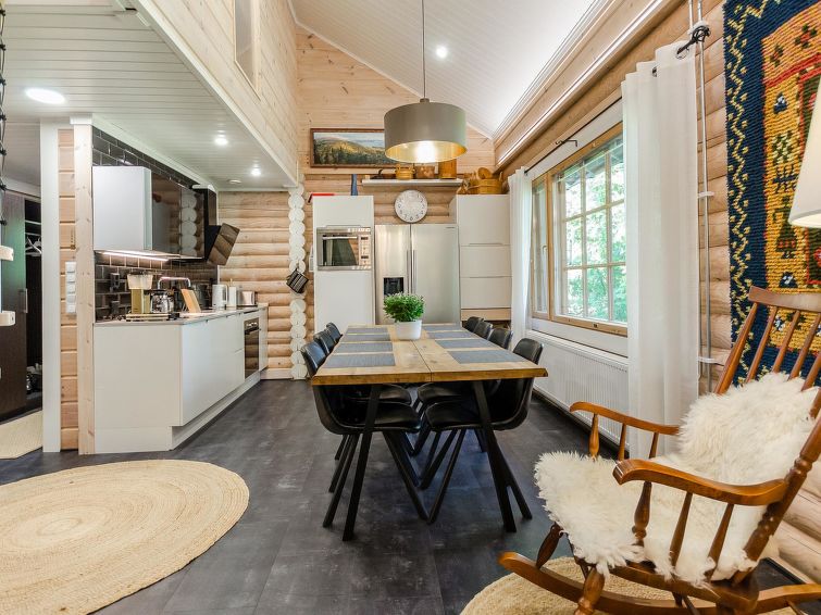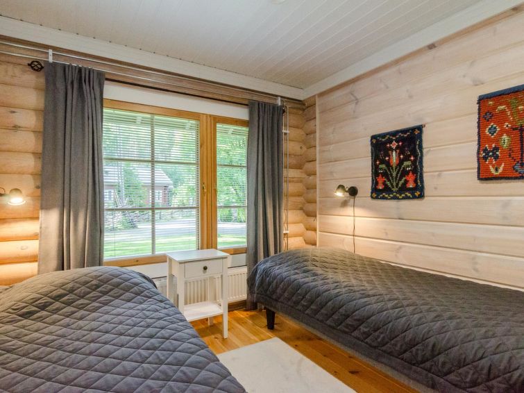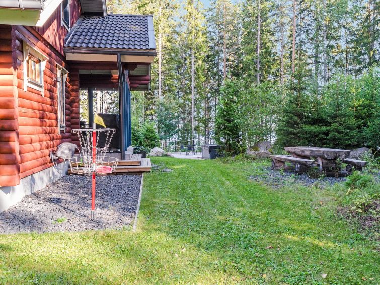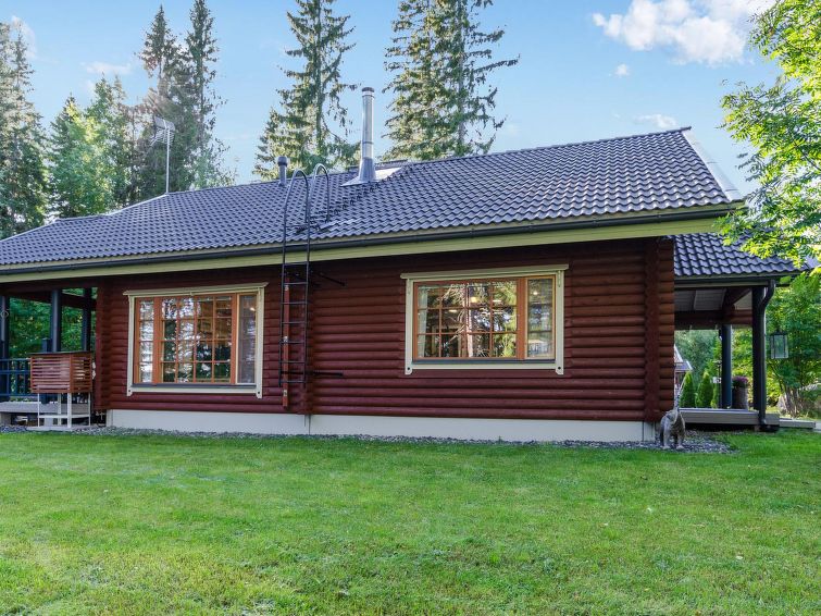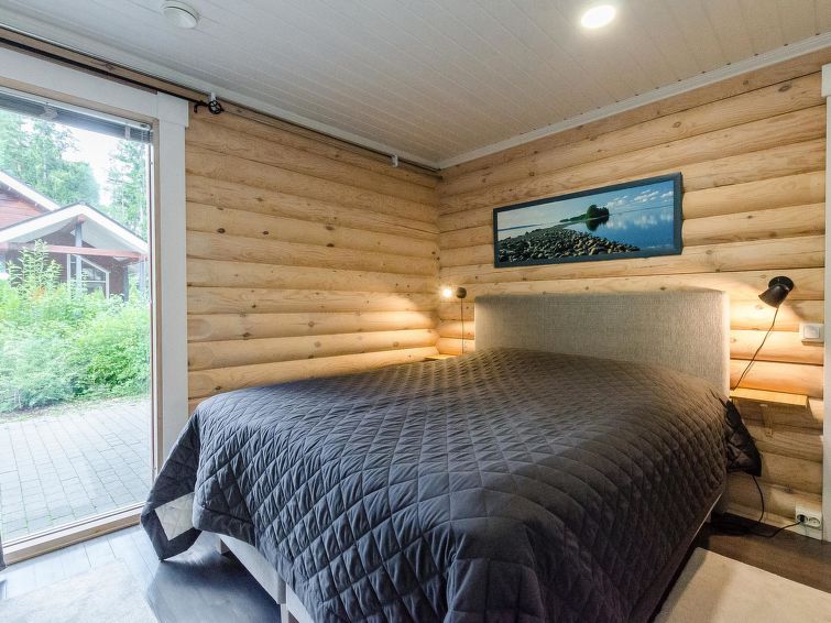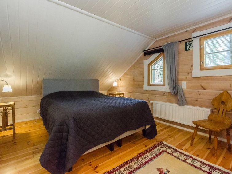 72 km to the north from Joensuu, lake Pielinen 65 m (871.2 km²), own rocky beach, own boat. Boardwalk leading to the lakeside. The log cabin was built in 2005 and completely renovated in 2020. Living room/kitchen, 2 bedrooms on the ground floor, one with double bed and the other with 2 beds. On the upper floor, there is a lounge loft and 2 bedrooms, one with a double bed and the other with 2 beds. Dressing/laundry room, washroom, electric sauna, terrace, and large patio.