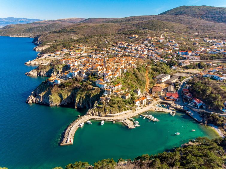 Dobbelthus "Villa Vali 2", med 2 etasjer, bygget i 2022. 300 m fra sentrum av Vrbnik, i en solrikt, høyt posisjon, 70 m fra sjøen, 70 m fra stranden, i en blindvei. Privat: tomt 300 m2 (inngjerdet), svømmebasseng kantete (5 x 4 m, dybde 140 cm, Sesongåpent: 01.Mai. - 15.Okt.) med bassengrensningssystem med saltelektrolyse. Utendørs dusj. I huset: internetilkobbling, vaskemaskin. Butikk 400 m, restaurant, småstenstrand, strand ved klipper, betonglagt strand 70 m.