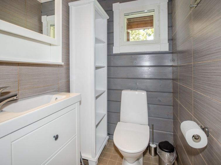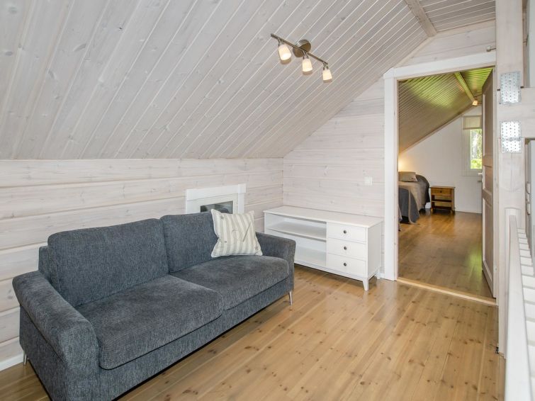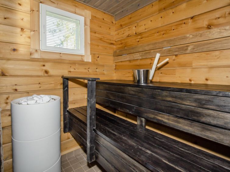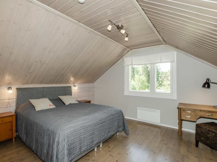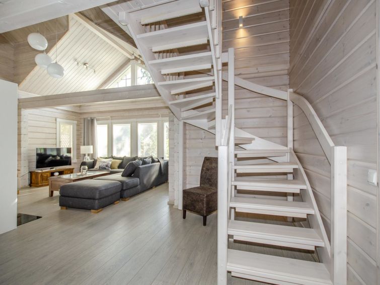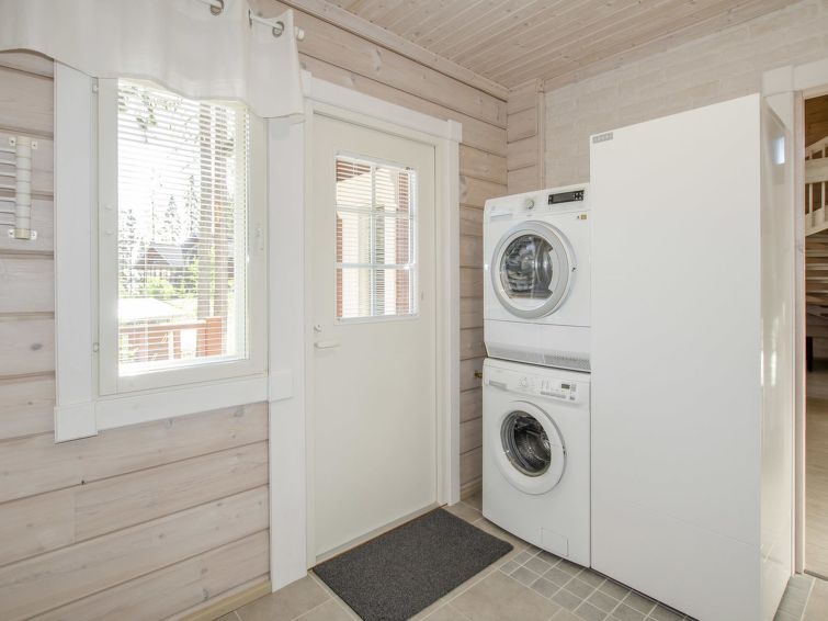 Log cabin 2020, living room/kitchen, bedroom with double bed, bedroom with 2 beds. On the upper floor bedroom with double bed and another bedroom with 2 beds and loft. Combined dressing and utility room, washroom, electric sauna, open veranda and terrace.
