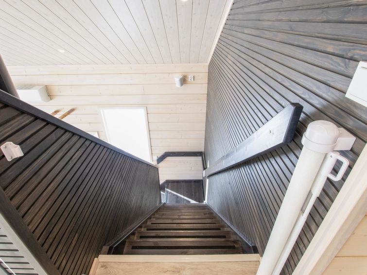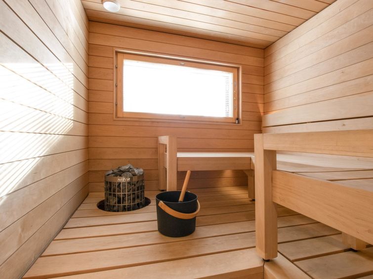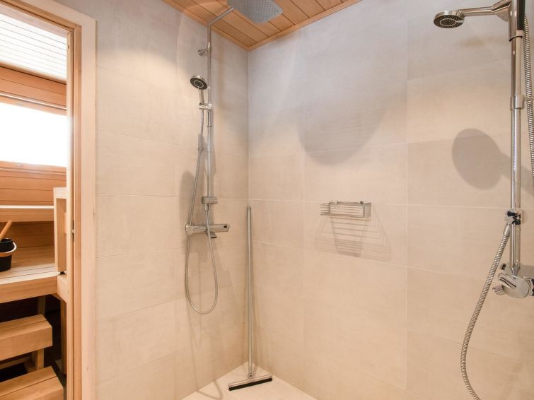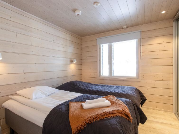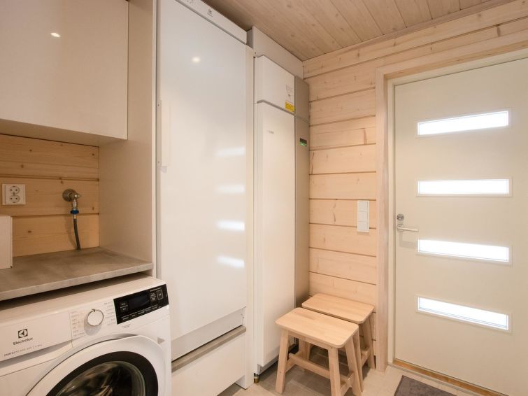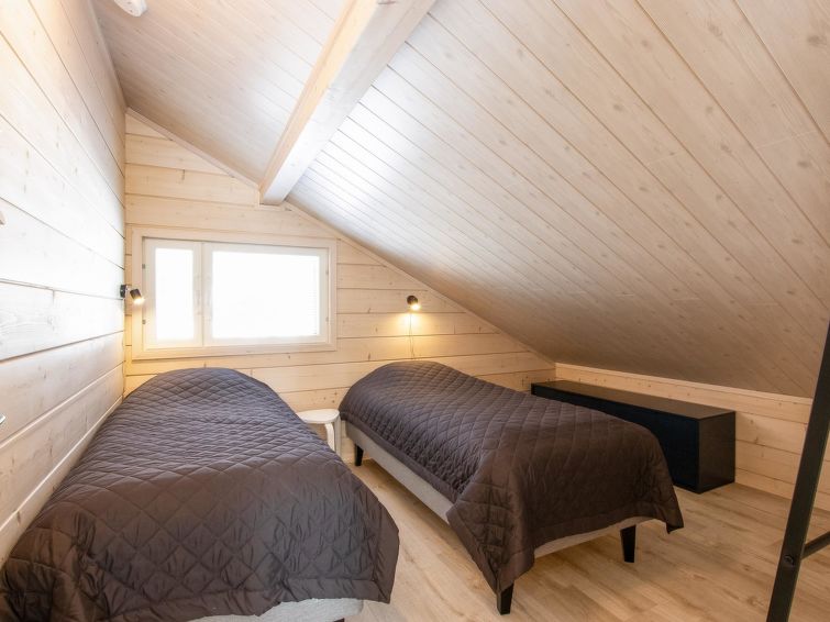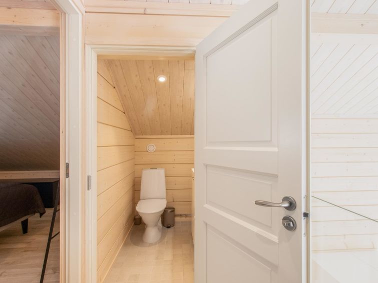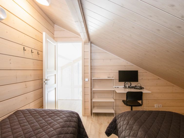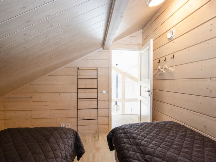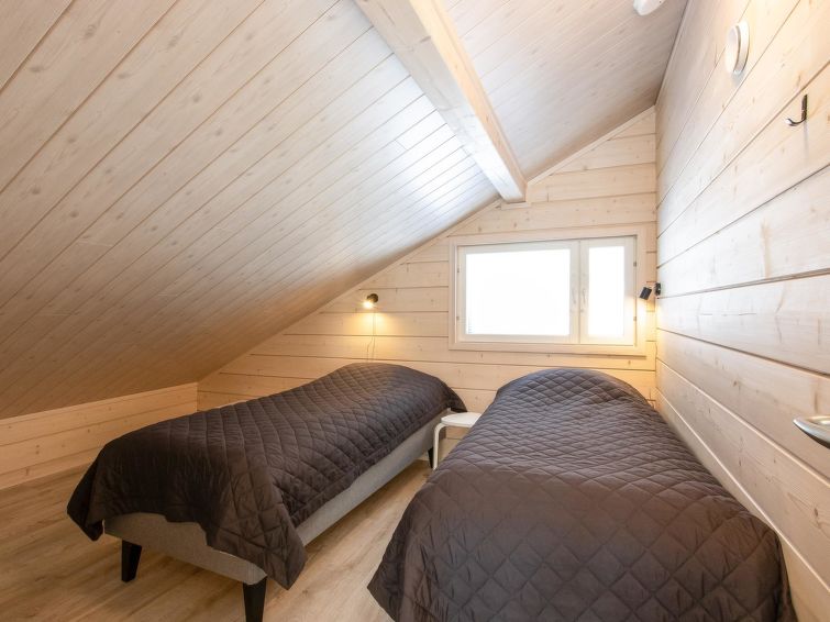 4 bedrooms, two are on the upper floor and two on the ground floor. One bedroom has a double bed (160x200cm) and all others have separate beds (80x200cm) that can be attached as double beds. The bedrooms on the upper floor have sloping ceilings. The second upper floor bedroom also has a desk for remote working. On the ground floor, spacious living room/kitchen and laundry facilities; electric sauna and two showers. In addition, utility room and separate WC. Another toilet on the upper floor as well. Access to the terrace from the utility room.