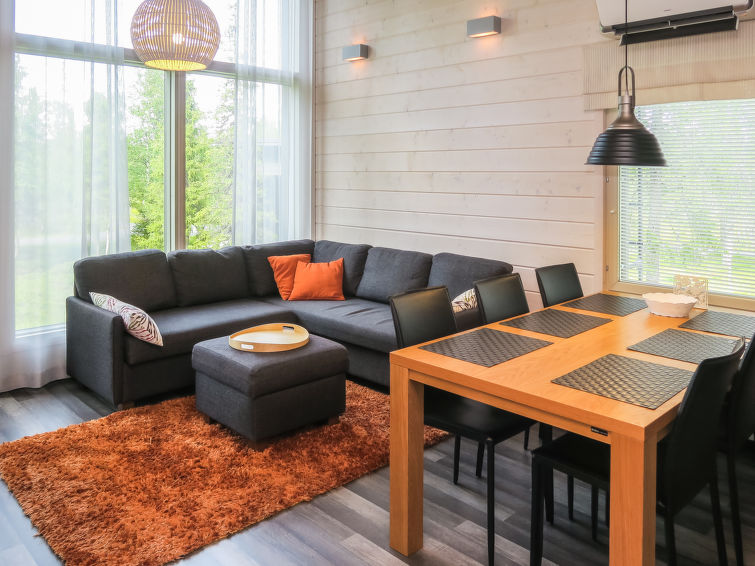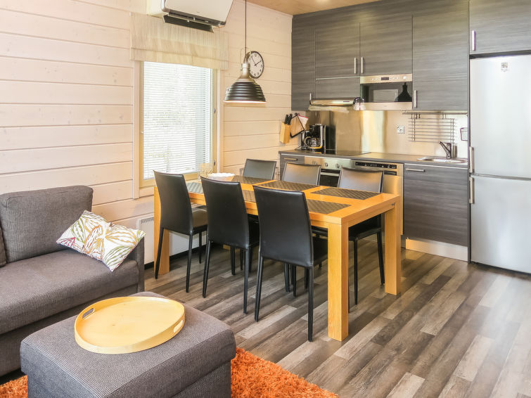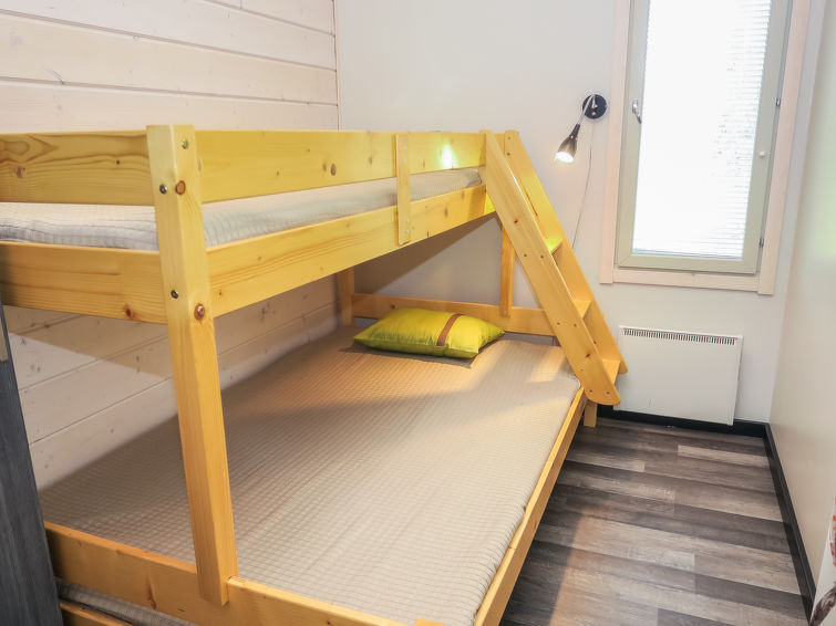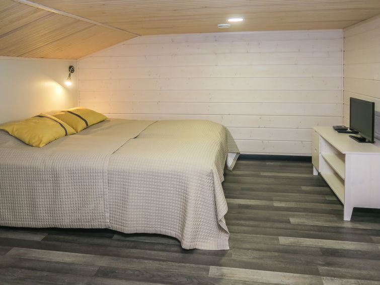 27 km North of Kuusamo, Ruka 5.0 km. Semi-detached cottage, built in 2013, bedroom 1: 2 beds, bedroom 2: 2 bunk bed (bottom bed 120 cm), loft: 4 beds, combined kitchen/ living room, electric sauna.
