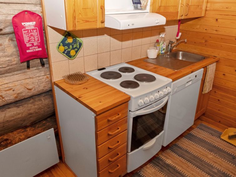 8 km north of Kuusamo, Ruka 19 km, Pond Ukonlampi 100 m, jetty, mud bottom, rowing boat. Log-built semi-detached house with loft, built in 1986, bedroom: double bed, loft (7 m², low room height): 2 beds, combined living room/kitchen: sofabed, electric sauna. Downstairs 60 m² + loft 7 m².