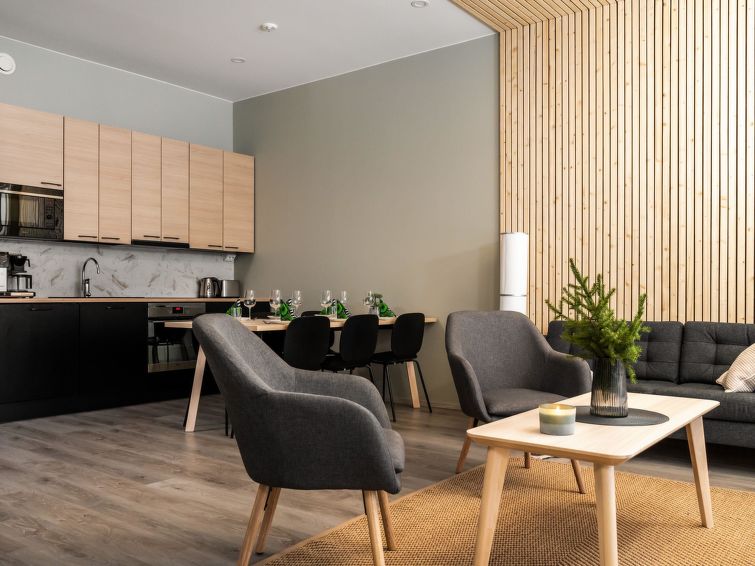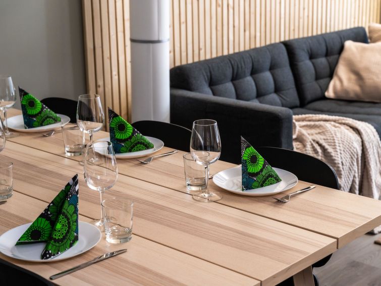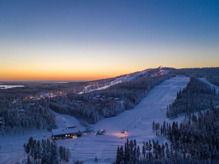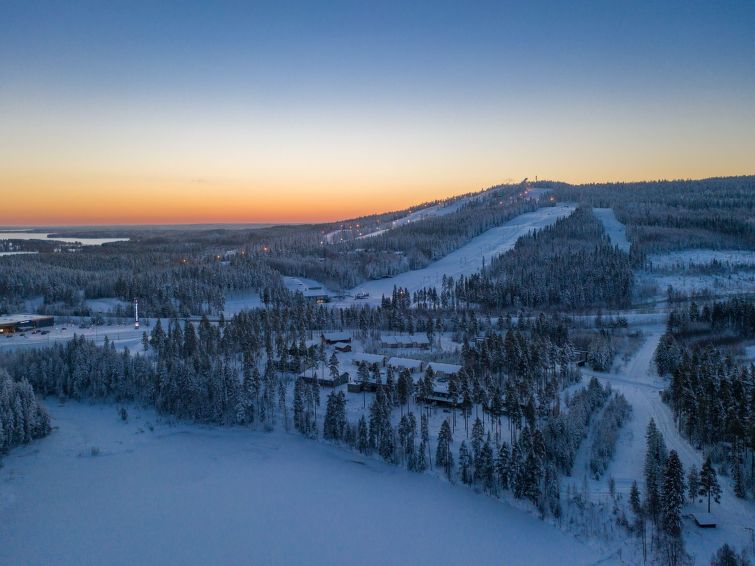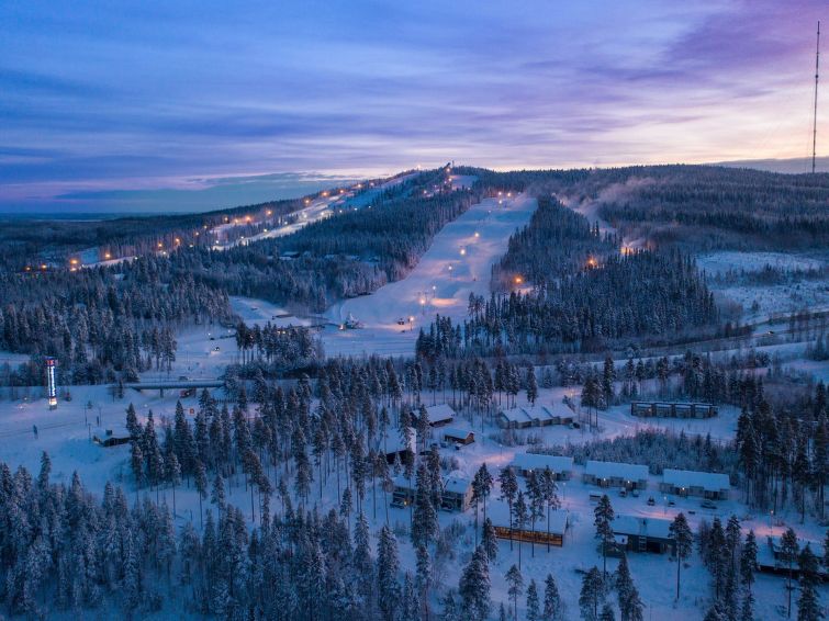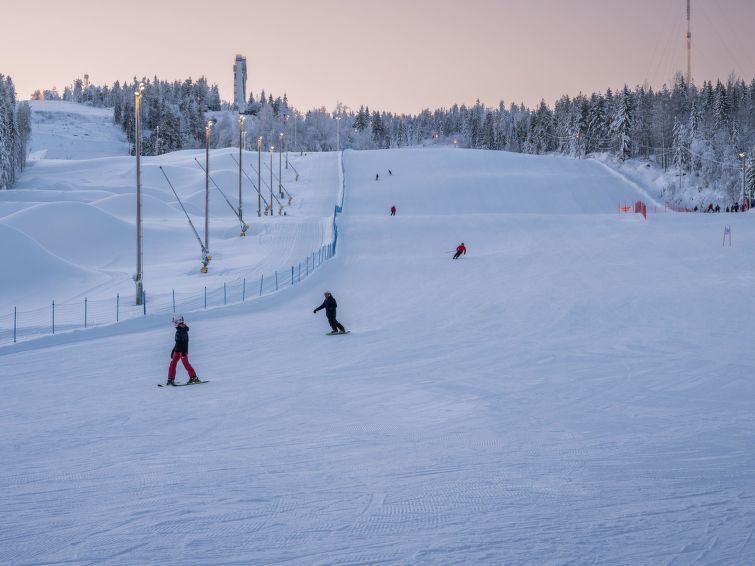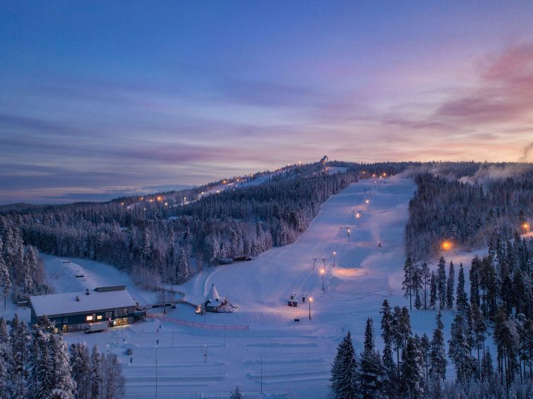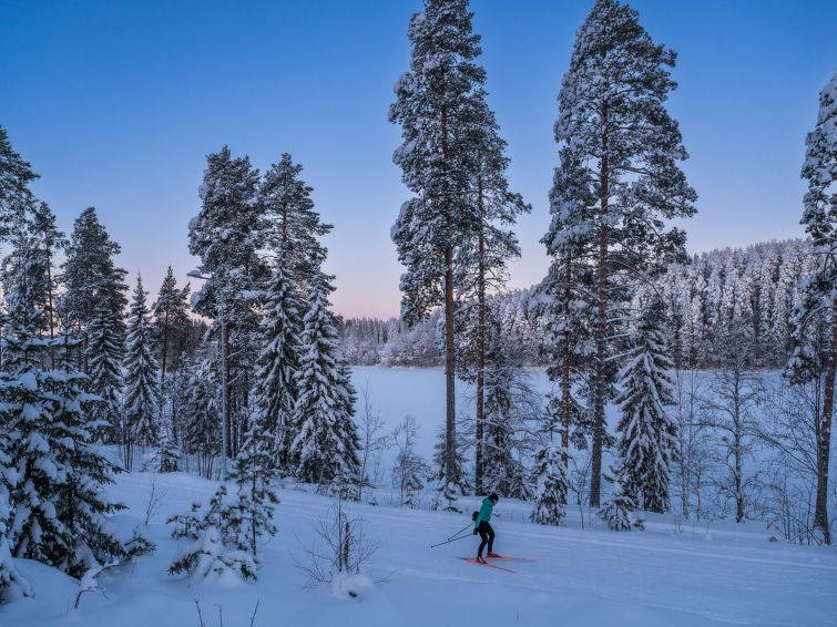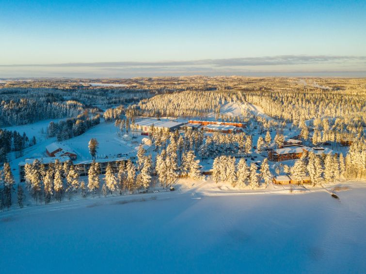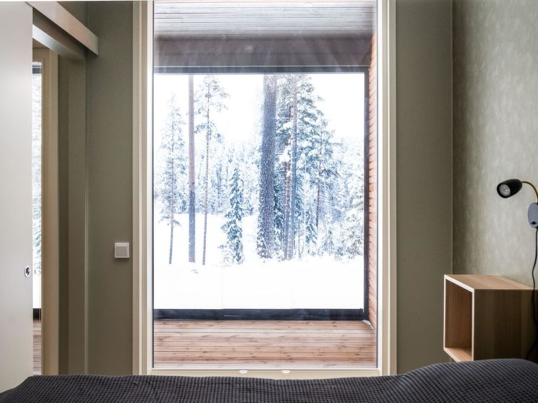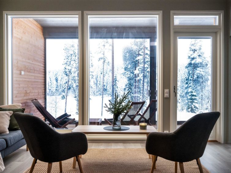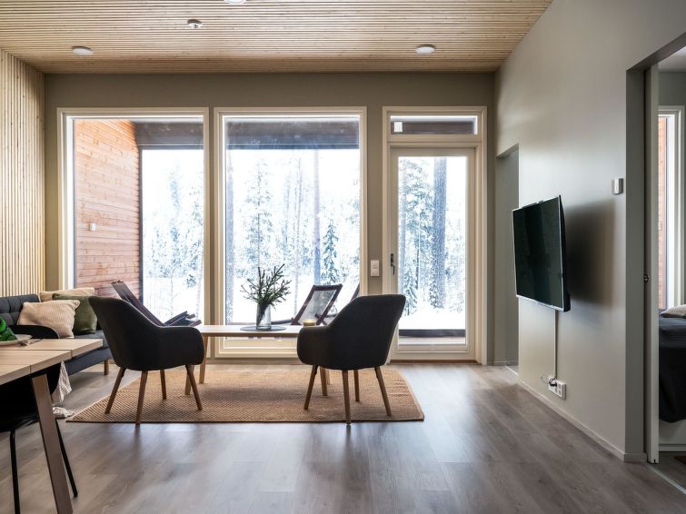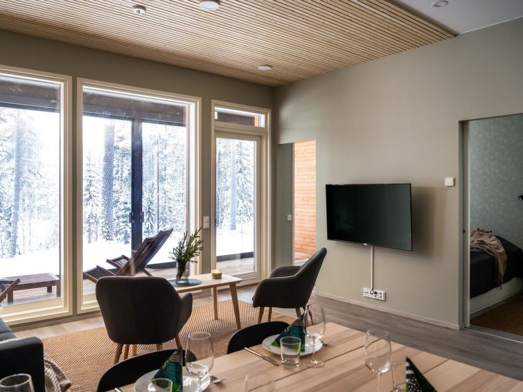 Additional equipment for families with small children: high chair for a baby, travel bed and potty. Do you want quality, activity and easy living of your holiday? This new destination has everything you need for a relaxing holiday. When you step in the apartment, the view to the living room, and from the high windows, is like from a postcard. The beautiful view of the pond Jäätiönlampi calms even the busiest holidaymakers mind, and a relaxing holiday is ready to begin. The apartment's elegant interior, functional space arrangements and comprehensive equipment meet the requirements of every holidaymaker. The living room kitchen has light, space and style. There is also a pleasant acoustic environment, that has achieved by using battens on the walls and the ceiling. There is really an opportunity to calm down and relax here. The bedrooms have enough space for up to 7 people. Pleasant steam of the sauna is provided by the pillar-style electric sauna stove (Harvia Cilindro brand) and the cooling on the spacious glazed terrace completes the sauna experience. Of course, a good holiday includes outdoor life and activities. Facilities are just around the corner. Just put skis on your feet, and you can start skiing directly from the yard. Well-maintained and illuminated ski trails are waiting. Everything else is within a short walk, including ski slopes, snowmobiles safaris, adventure park, hiking trails, fishing, swimming areas, spa and shopping center and much more.