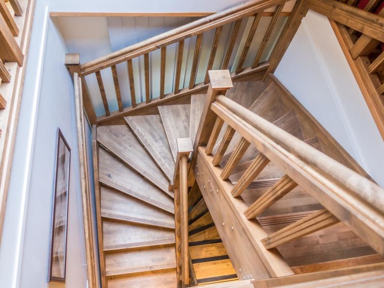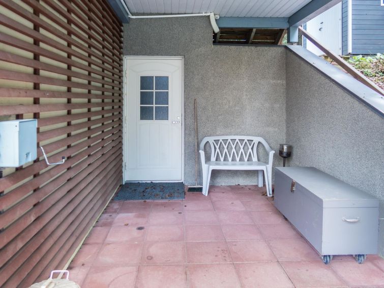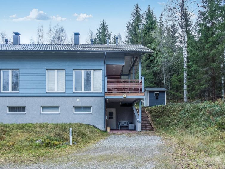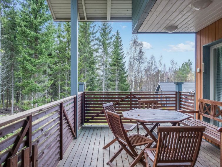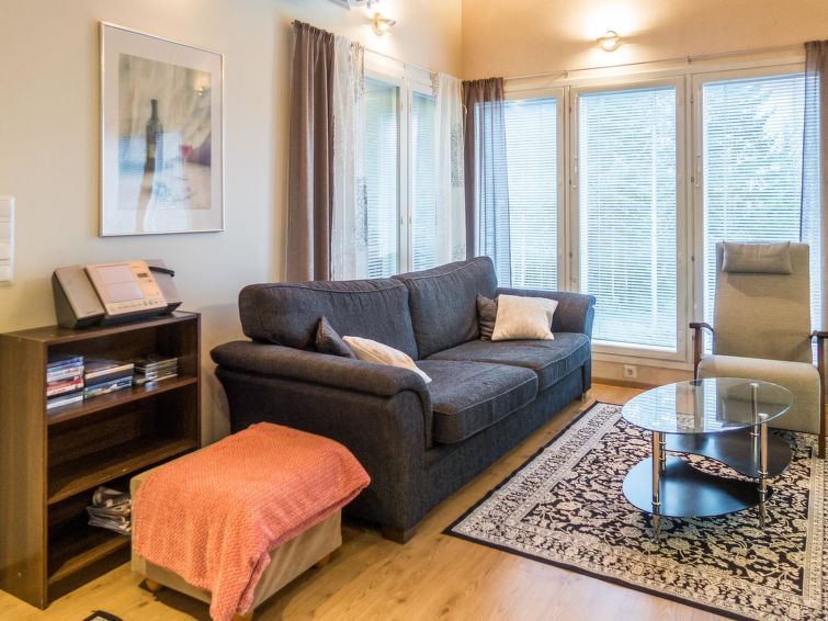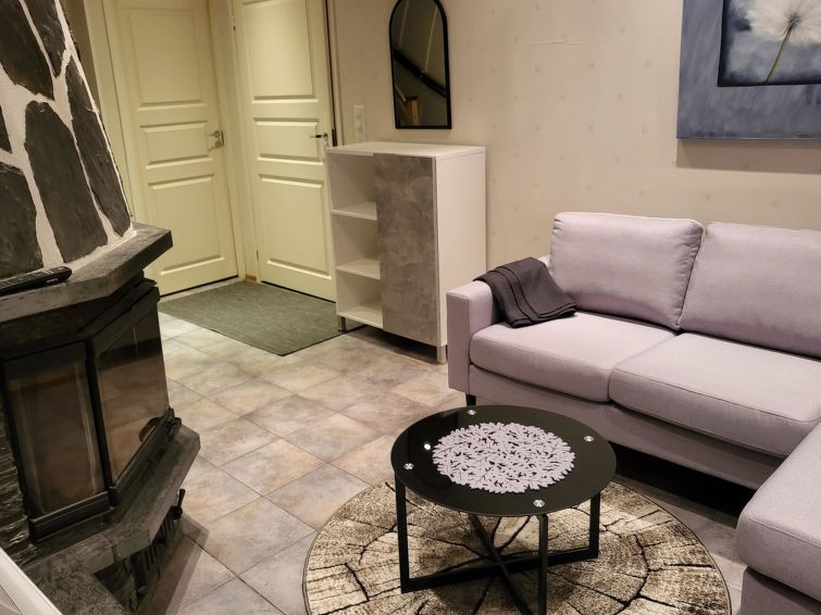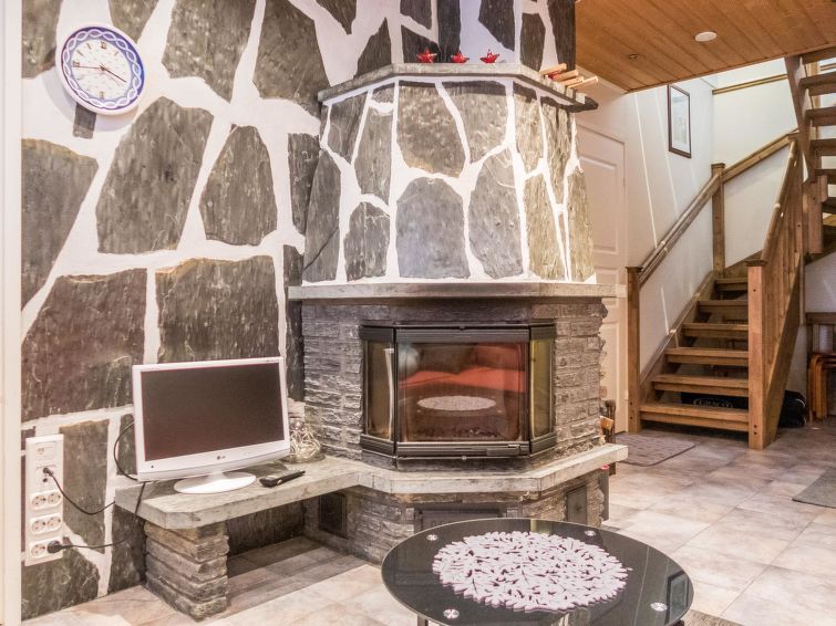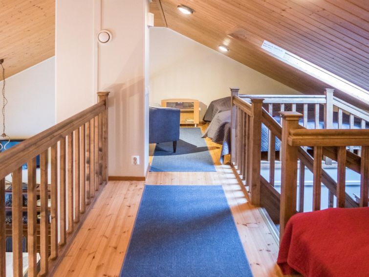 Total area approx. 112 m², on three floors. On the middle floor, an open kitchen and living room, a dining set for 6-8. A bedroom with a double bed (160 cm). Separate toilet. In the open loft, separate beds for 4 (2 x 80 cm and 2 x 110 cm beds), the loft is open space. On the lowest floor, a room with a fireplace, with a sofa bed for 1-2 as an alternative bed, and a bedroom with a double bed (160 cm). Washroom/toilet and sauna (electric stove), in addition a small utility room (washing machine, cleaning equipment). There is a drying cabinet in the airing cupboard downstairs. In connection with the middle floor, a terrace/balcony with garden furniture and an electric grill (in use during the summer).
