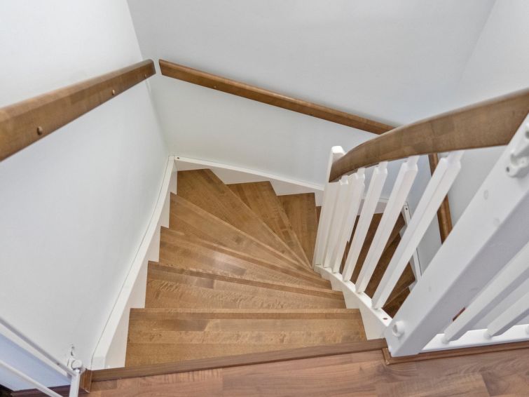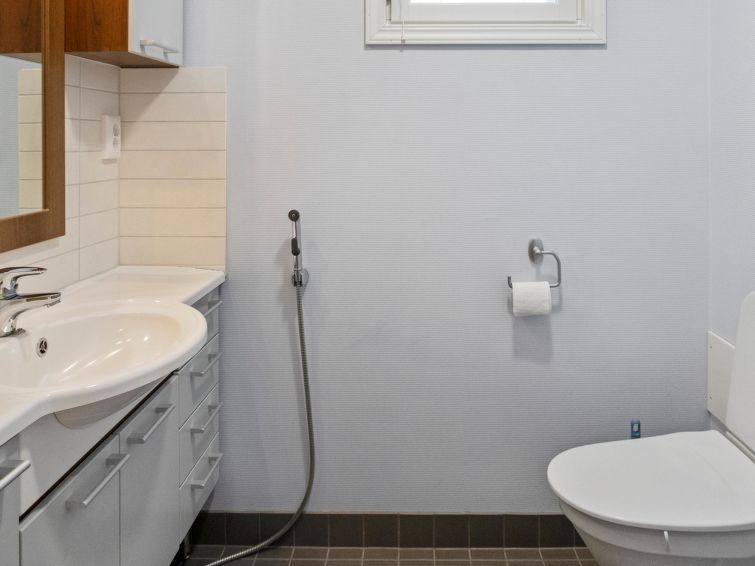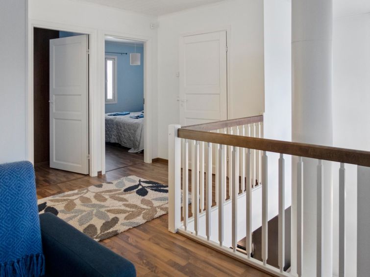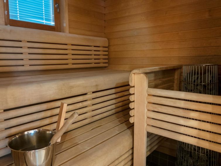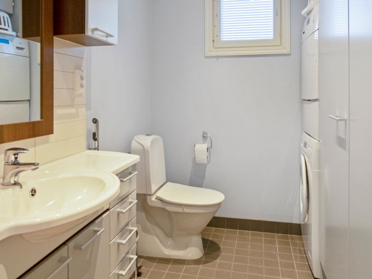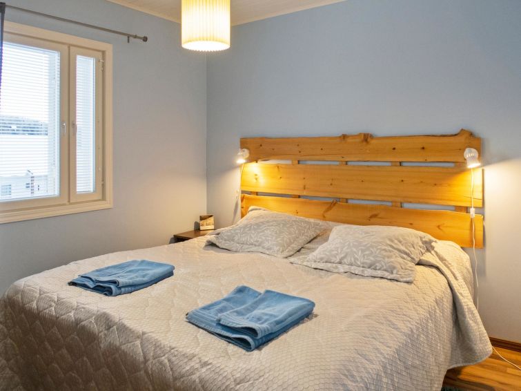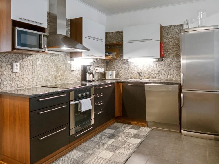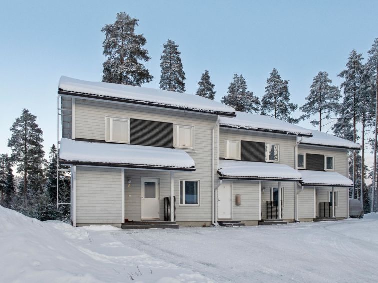 This row house apartment located in Vuokatti was completed in January 2010. Floor area 93 m². On the ground floor there is living room, dining room, kitchen, sauna (electric heating), washroom, toilet. Upstairs there is bedroom with twin bed and bedroom with separate beds for two. Loft with sofabed for 2 persons (width 120 cm), household room, toilet and balcony. Lockable, cold storage.