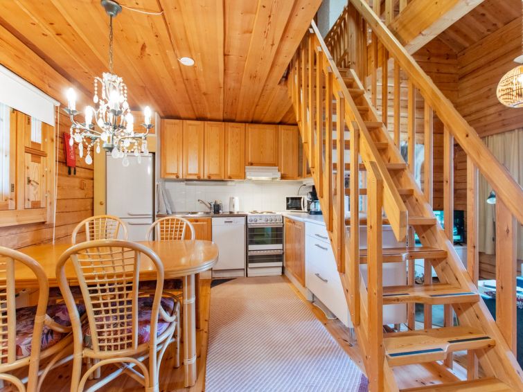 Apartment area 46 m² + loft 15 m². The living room kitchen has an atmospheric fireplace, a bedroom with a double bed, 2 single beds in the loft (superlo mattresses) and a toilet. Washroom, sauna (with electric stove), toilet, terrace.