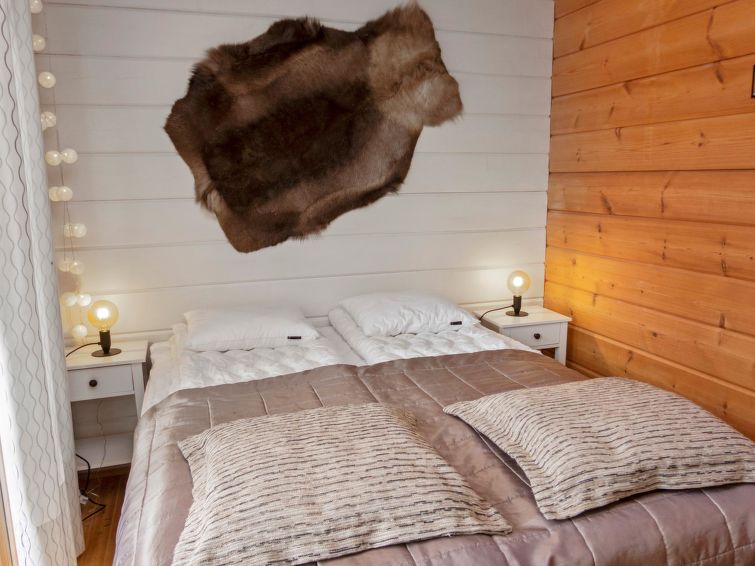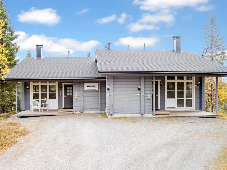 25 km north of Kuusamo, Vuosseli (Eastern Ruka) 1.8 km, Ruka village (Western Ruka) 3.8 km. Apartment in log-built semi-detached house, built in 2000. Kitchen/livingroom, bedroom: double bed, loft: 4 beds, electric sauna. Area 58 m², loft (sloping ceilings) 20 m². Semi-detached house situated on Vuosselinrinne area. Other semi-detached houses and cottages in the area.