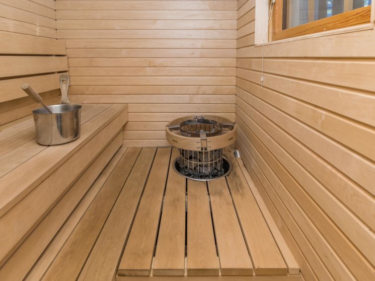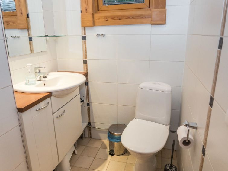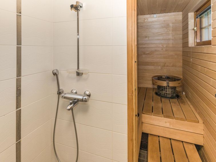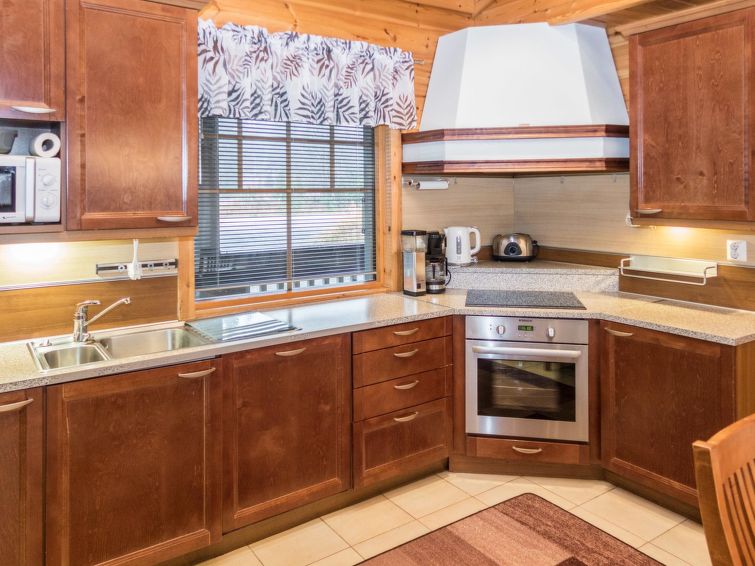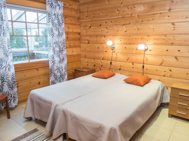 25 km north of Kuusamo, Vuosseli (Eastern Ruka) 300 m. Apartment in three-storey log-built row house of three apartments (end-of-house apartment) built in 2005, bedrooms 1-4: 2 spring mattress beds, loft: 4 spring mattress beds, steep and narrow spiral stairs, bathroom downstairs, combined kitchen/living room, electric sauna. Area 98 m², loft 21 m² (loft 160 cm, partly 210 cm high).