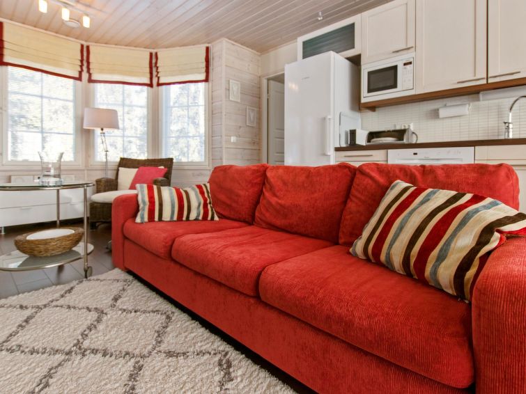 25 km north of Kuusamo, Vuosseli (Eastern Ruka) 1.2 km. Log-panelled cottage, built in 2006, bedroom 1: double bed, bedroom 2: 2 spring mattress beds, bedroom in loft: 4 spring mattress beds + 2 mattresses, combined kitchen/living room. Electric sauna, dressing room, 2 showers. Downstairs 78 m² + upstairs 30 m².