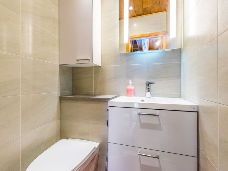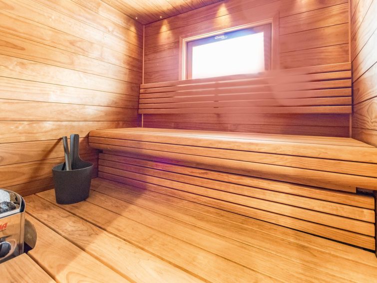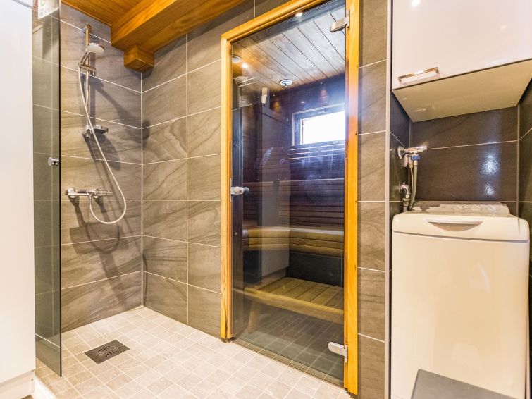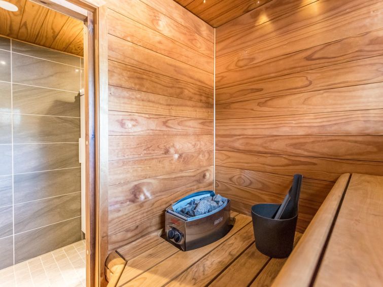 Downstairs bedroom: double bed, loft: 2 beds, combined kitchen/living room, wash room, electric sauna, toilet, terrace. Downstairs 40 m² + loft 12 m².