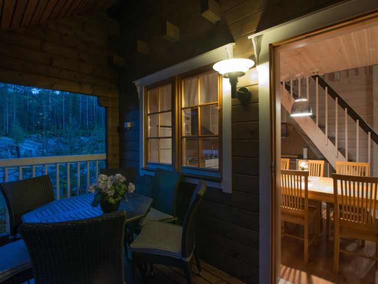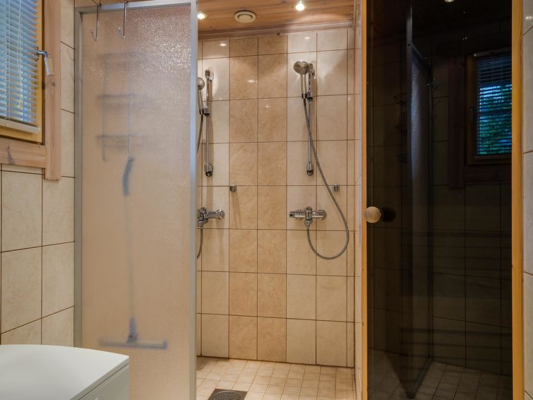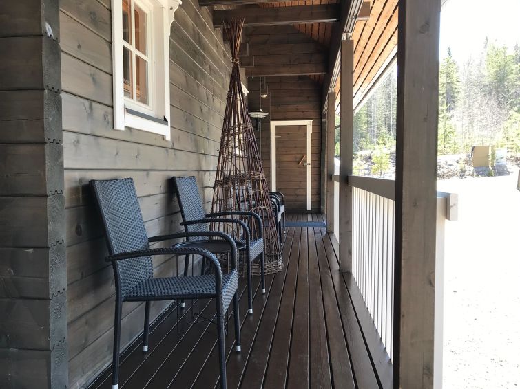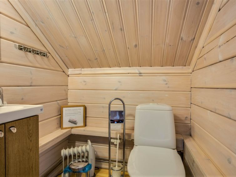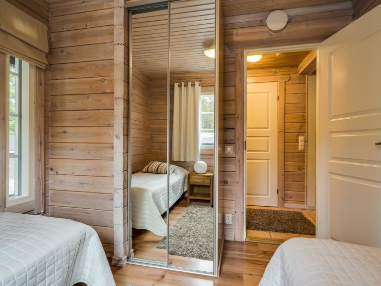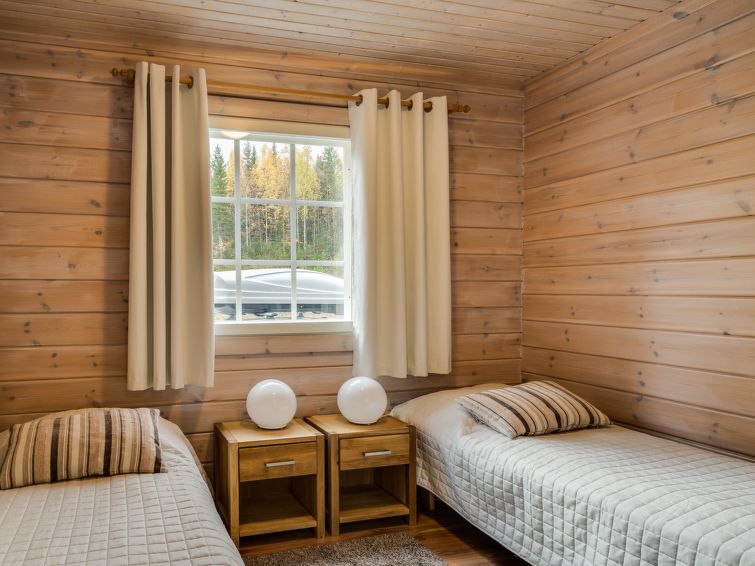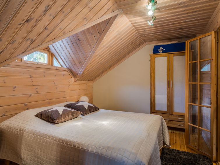 This semi-detached log holiday house located in Vuokatti ski centre was completed in 2003. Floor area 82m² , loft 27m². On ground floor there is combined living room & kitchen, bedroom with 2 beds, sauna (electric heating), washroom and toilet. Upstairs there is bedroom with 2 beds, loft vestibule with 140 cm wide bed and sofa bed and toilet. Bed and chair for a baby. Internet connection (wireless, speed 1 MB). Kajaani 33 km, Sotkamo 7 km, Vuokatti ski slope 100 m, cross country track 50 m. Beach 1,5 km. Cleaning not included, cleaning can be booked as additional service. Linen are available for rent. No pets allowed.