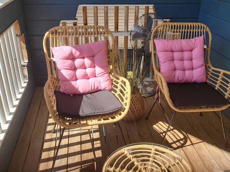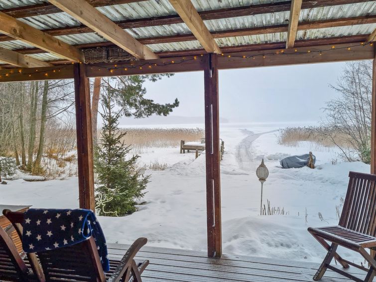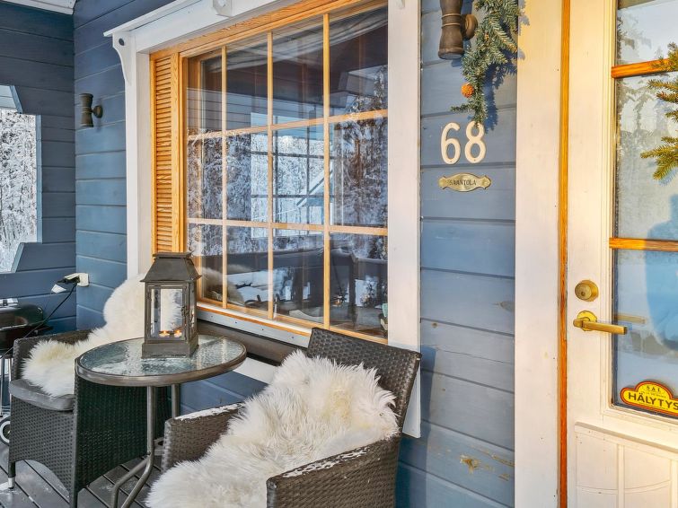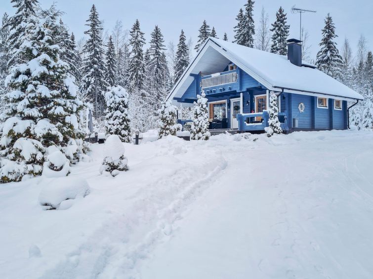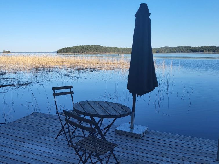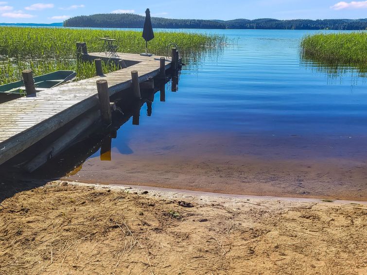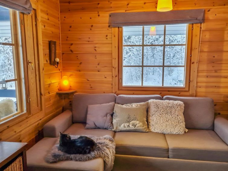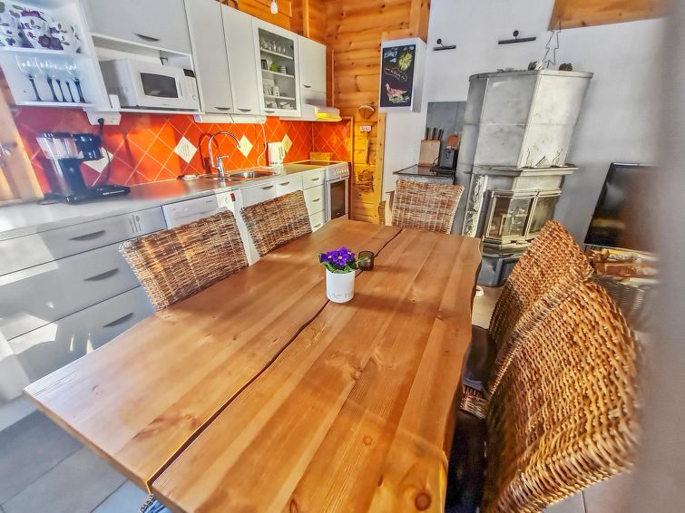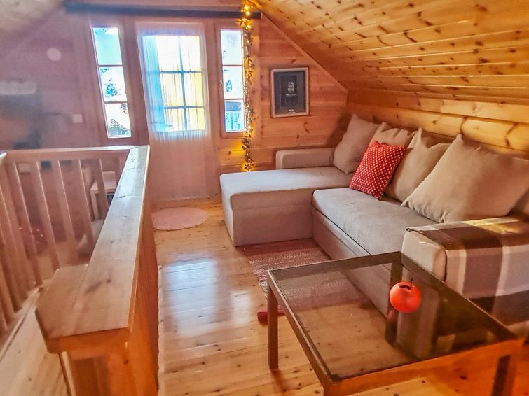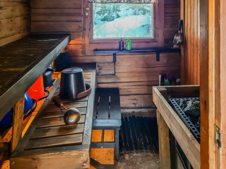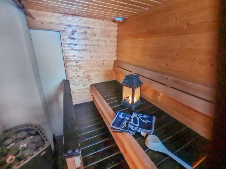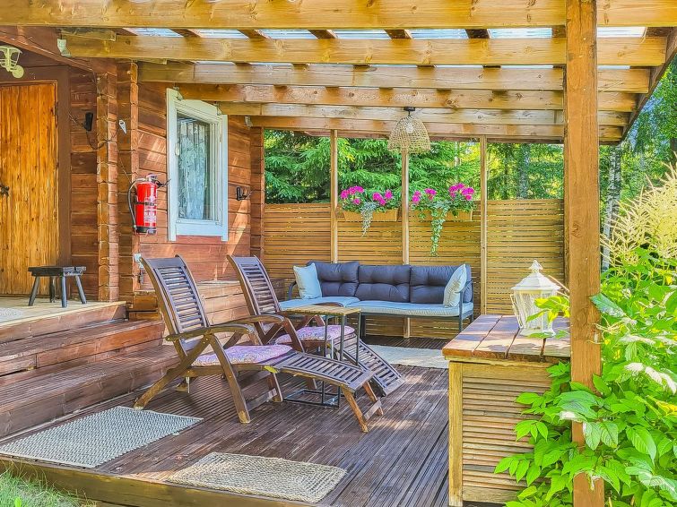 Log cabin 2009, kitchen-living room with a sofa bed for 2 persons, dressing room, bathroom, toilet, sauna (wood stove) and terrace. Upstairs with a double bed and a sofa bed for 2 persons and balcony. Downstairs with air source heat pump, underfloor heating and a wood burning stove. 2 fridge-freezers. Small barbecue (bring the coals with you).