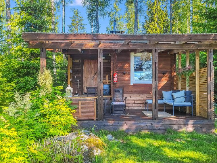 Electrified Lakeside sauna with a living room with a sofa bed for two (in summer use) and a small terrace. Water must be carried from the lake into the sauna, distance 10 m to lake. Refrigerator and coffee maker, no heating in the living room. Outdoor privy beside the sauna building.