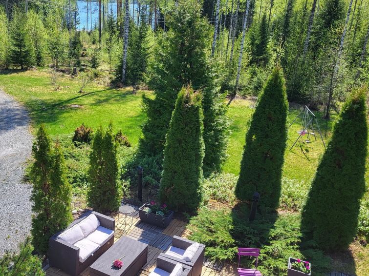 Distance 200 m from cottage to lakeside sauna. Between cottage and lakeside sauna is a road (goes to 3 cottage neighbors). From the map will see the exact location of the cottage to the beach. The villa is situated on a gentle slope, surrounded by lawn. In front of the villa there is a barbecue terrace. On the plot there is also a storage building and a wood shed. Swing children.