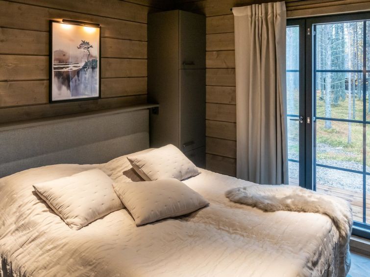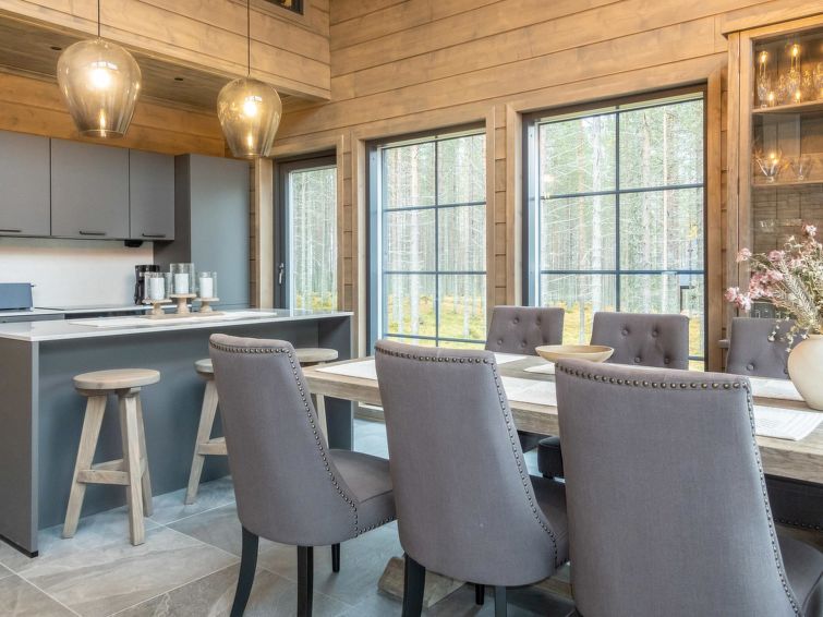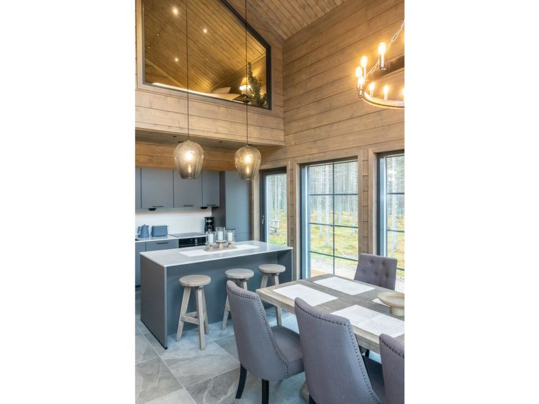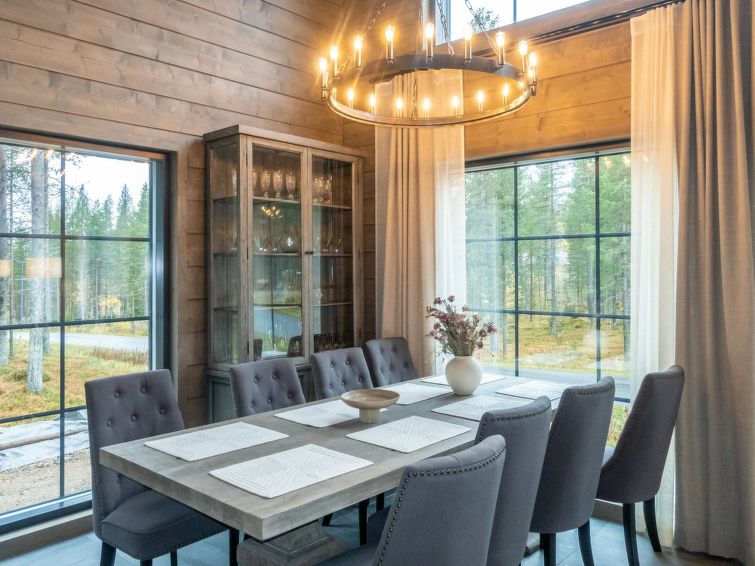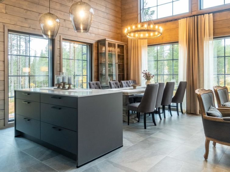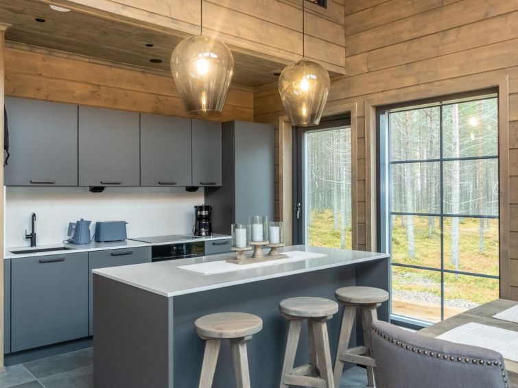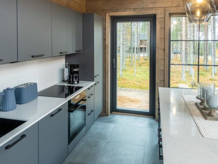 The kitchen island has a lot of working space, and you can prepare food while you can see beautiful fell landscapes from the windows. You cannot find better cooking experience from Lapland. The kitchen has tableware for 12 people, and the cupboards also have a lot of serving dishes for a beautiful setting. The kitchen equipment includes, in addition to all household appliances and kitchen accessories, e.g. blender, waffle iron and electric mixer.