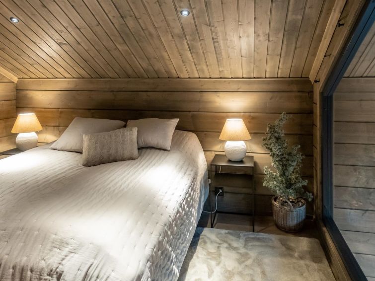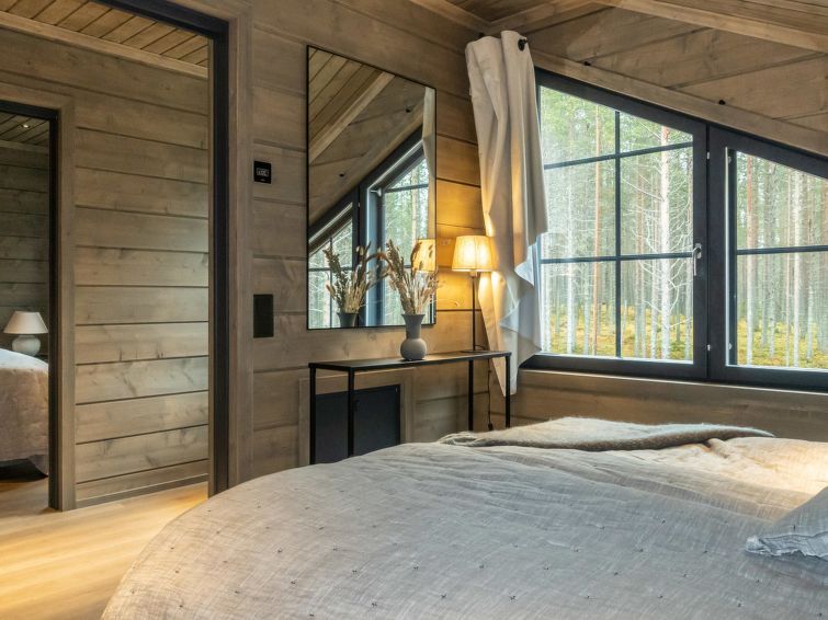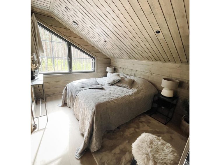 On the ground floor, there is one of Willa's four bedrooms. The bedroom has high-quality 180 cm wide bed and very high-quality pillows and blankets. The room is wonderfully bright thanks to the floor-to-ceiling window, but at night the bedroom can be darkened with a blackout curtain.