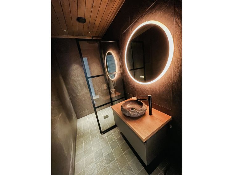 Washroom and sauna are also on the ground floor, entrance from the hall. In addition to WC, the washroom has a sauna and two showers. The washroom also has a washing machine and tumble dryer.