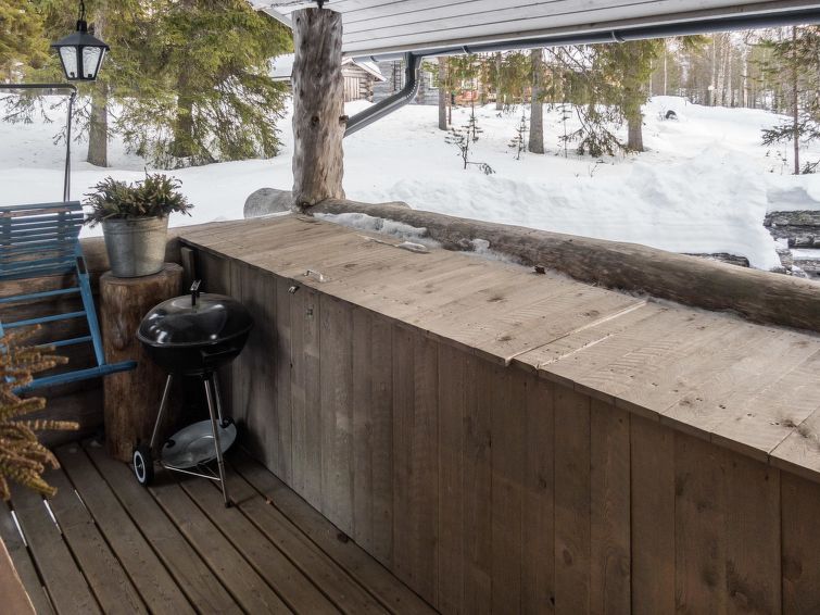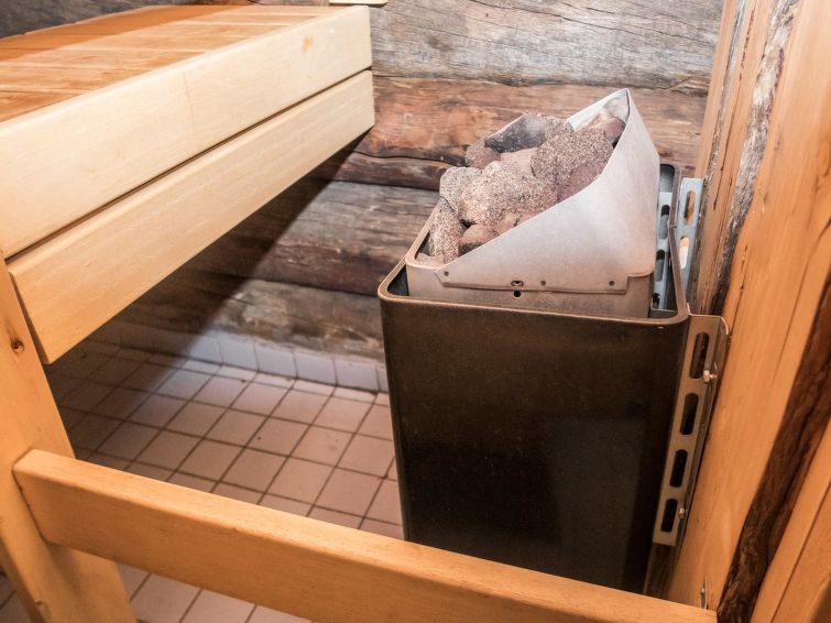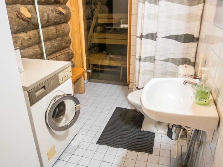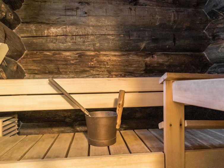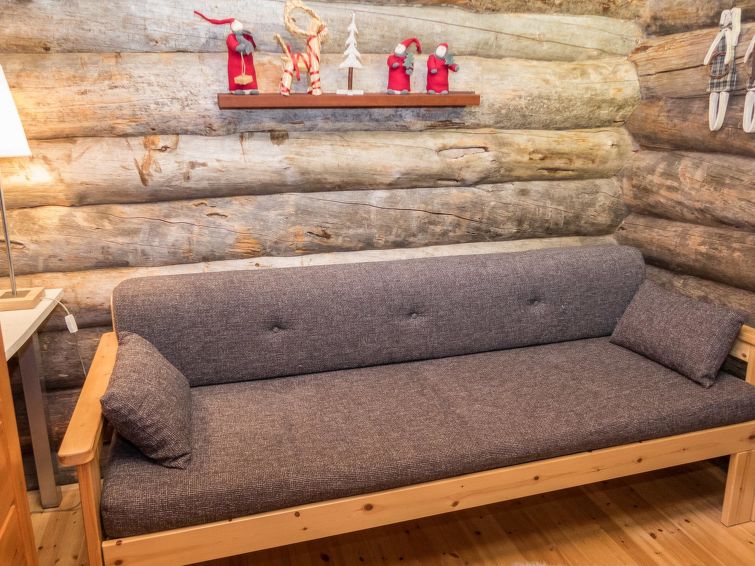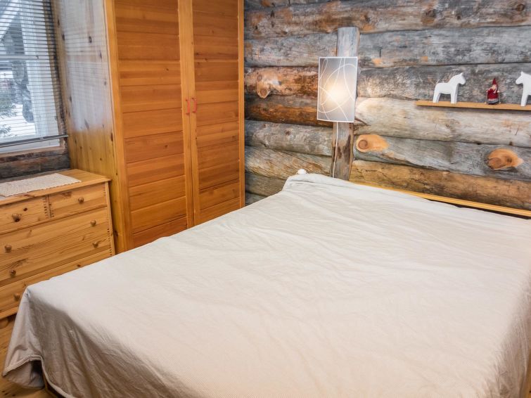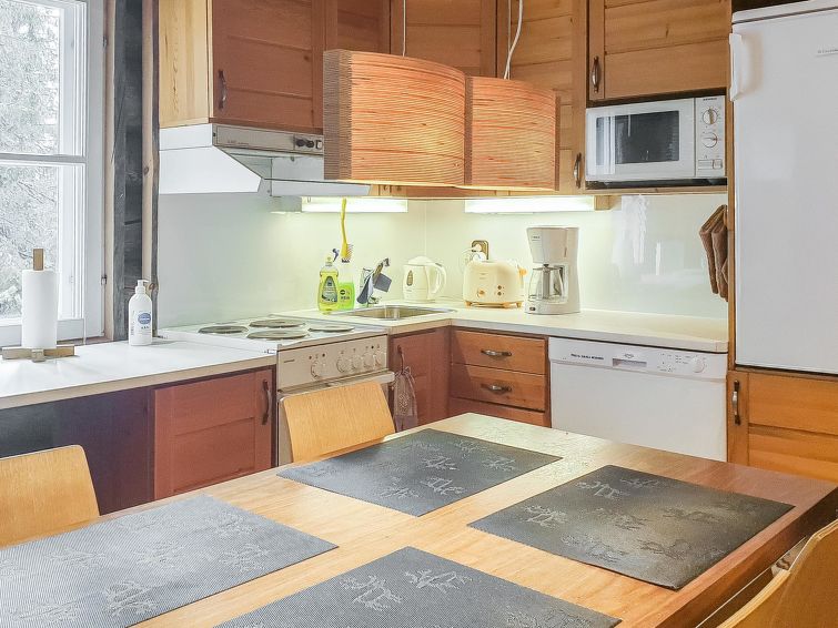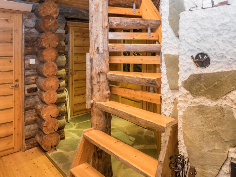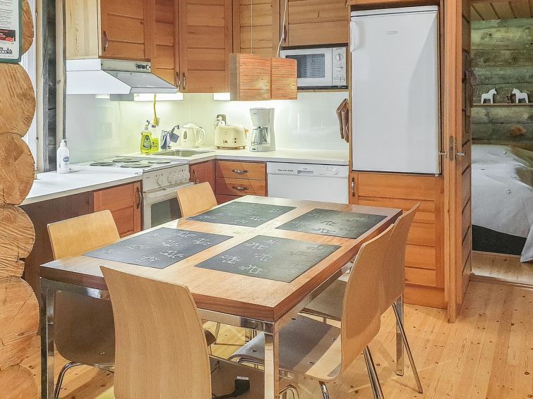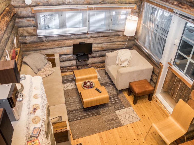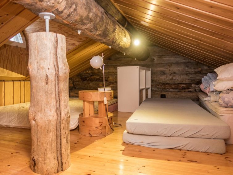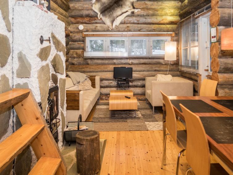 27 km north of Kuusamo, Ruka village (Western Ruka) 3 km. Traditional Lappish style "kelo"-log cottage. Semidetached apartment with practical floor plan and decor, built in 1989. There are 2 bedrooms, bigger one with a doublebed and smaller one with a bunk for 2 persons. Spacious loft (9 m²) with a window and 4 mattresses. Combined kitchen/livingroom. Electric sauna and spacious terrace. Back yard for children to play. Lockable ski storage. Area is located near highway nr 5. Car parking in the front of the apartment. Nearest skilift Talvijärvi, distance accross the lake by walk/ski about 800 m.