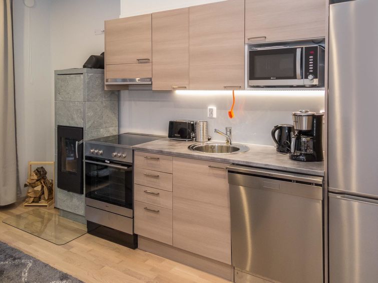 40 km to the northeast from Kolari, lake Ylläsjärvi approx. 4 km, swimming beach approx. 4,5 km. 42,5 m² holiday apartment on the third floor, the house was built in 2019. There are living room/kitchen with a spreadable sofa bed, bedroom (two separate beds), washroom/WC and sauna (electric sauna stove) in the apartment. The housing company has a shared storage space including a laundry room (washing machine and two drying cabinets) and a ski waxing table. These facilities can be used freely. In addition, there is a storage cage for each apartment. The cage can be used, for example, for storing fuelwood and skis. Airsource heating pump for heating and cooling. Ylälänsi is a cozy three storey loft house in a calm area nearby ski slopes and ski trails. There are 11 apartments in the house. The closest ski lift is Länsiraja (check opening hours www.yllas.fi). Final cleaning is included in the prices. Bed linen can be rented. Pets are not allowed.