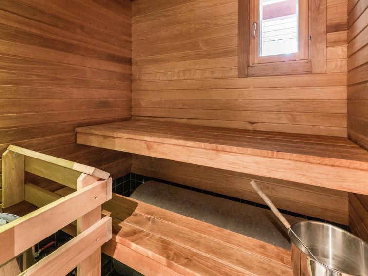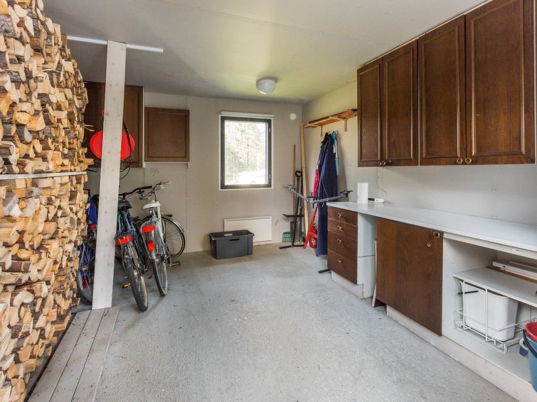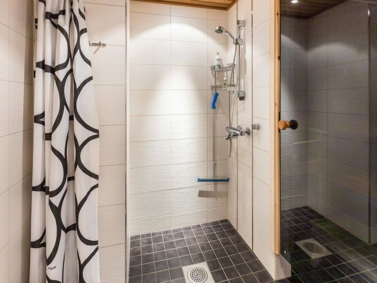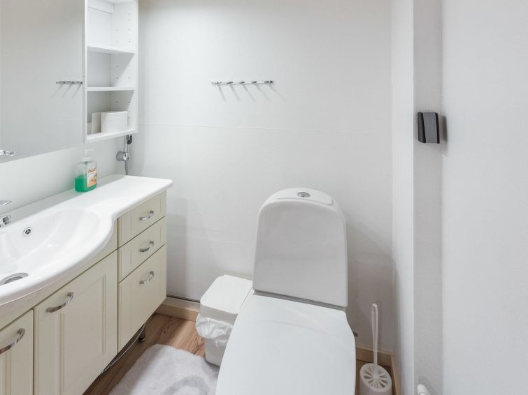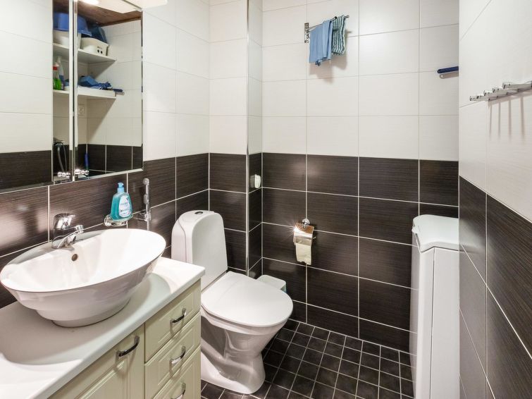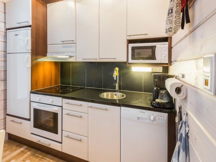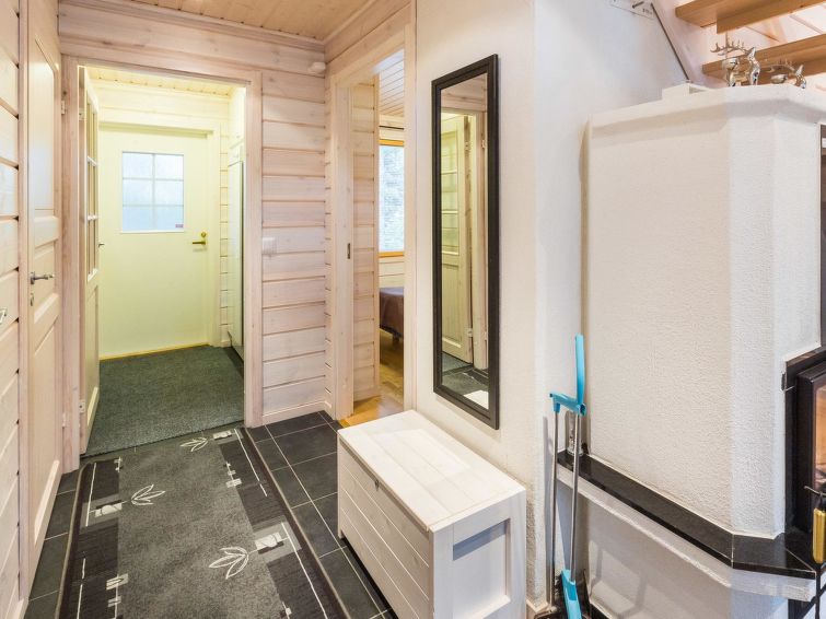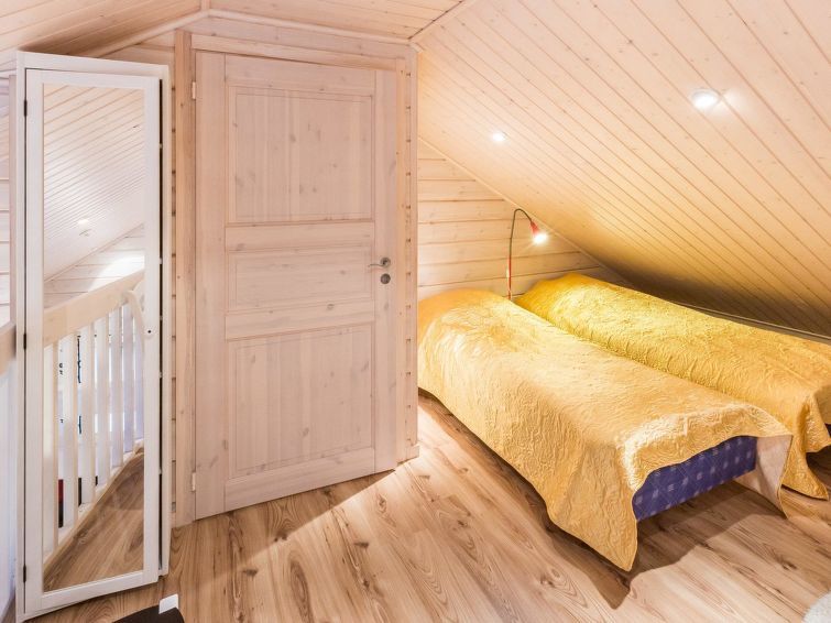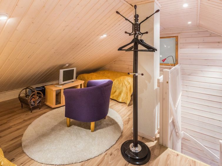 40 km north-east of Kolari, lake Ylläsjärvi 2 km, swimming beach 3 km,Sport Resort Ylläs approx 6 km, A Log apartment, built 2009. Livingroom/kitchen, one bedroom with double bed, loft with four separate beds and an bed for a baby, electric sauna, shower, two toilet (one on the loft and the other in the washing room). Total area 52 m² of which 9 m² on the loft. The apartment is also equipped with a hairdryer, a kettle and coffee machine, 2 bicycles, 3 snowshoes, a sledge and a kicksled. Homely duplex apartment located in the Ylläsjärvi village Tieva area (address: Järvitievantie 26). Apartment is situated in a peaceful area near the skiing tracks and snow mobile routes. No pets allowed. Proces include final cleaning, bed linen available for rent.