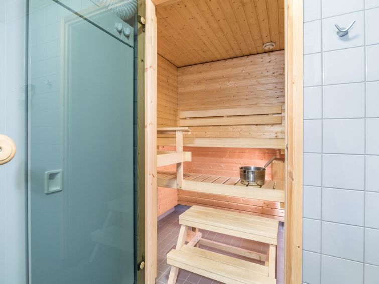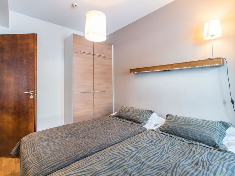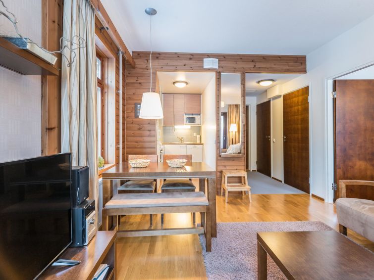 Apartment hotel located 165 km north of Rovaniemi in the Ylläsjärvi village Iso-Ylläs area, near the ski center. Built 2006. Bottom floor has a grocery store and storage space with ski maintenance room for the customers' use. A connecting tunnel gives access to the swimming pools and spa and restaurant services of Lapland Hotel Saaga. This second floor apartment has livingroom/kithcen with bed sofa, bedroom with two beds, washing room, toilet, sauna, ski-waxing room, porch, storage space. Broadband connection, DVD-player.