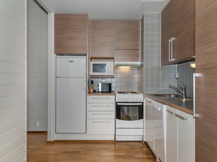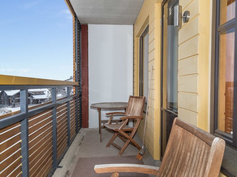 165 km to the north from Rovaniemi, in the tourist village of Ylläsjärvi, apartment hotel nearby Sport Resort Ylläs, built in 2006. The apartment has a living room with a sofa bed, 2 bedrooms, one with 2 single beds and bedchair as an extra bed, another with 2 single beds, washroom/WC, sauna, separate toilet. The apartment is located on the 3rd floor, view over the village of Ylläsjärvi.