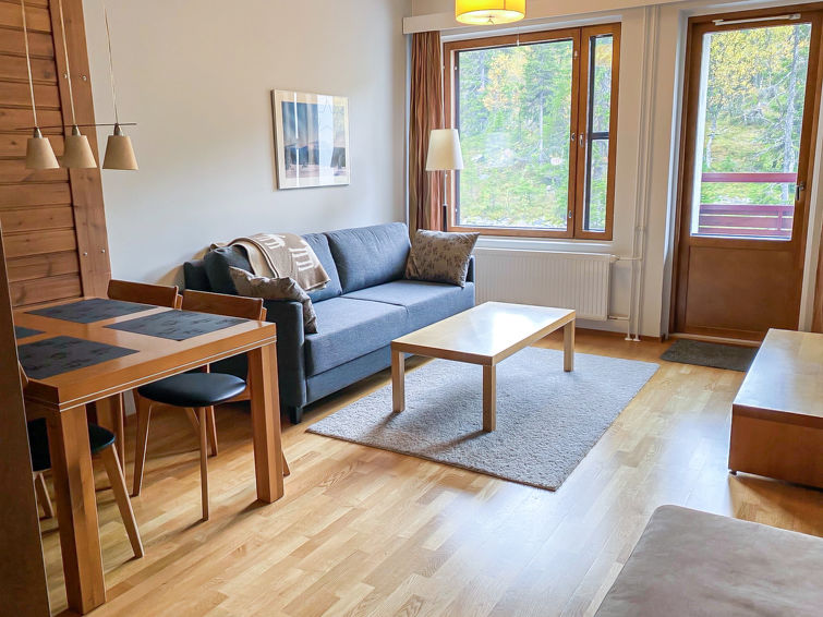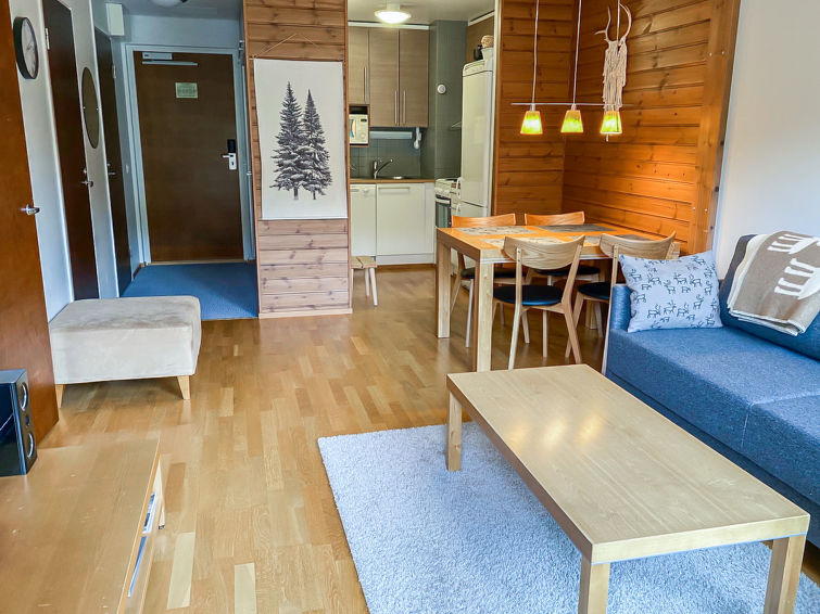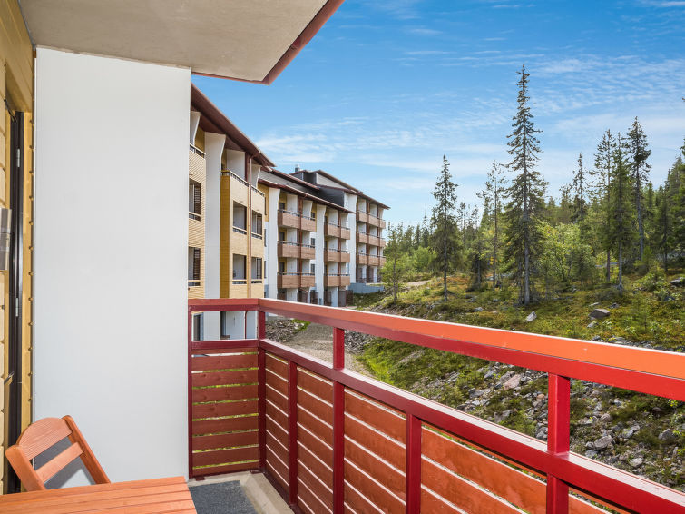 Apartment has one bedroom with two beds, livingroom with bed sofa, kitchen niche, sauna. Apartment is located on the third floor so it has a great view of the slopes of Ylläs fell. There's an elevator in the building.