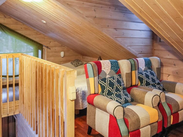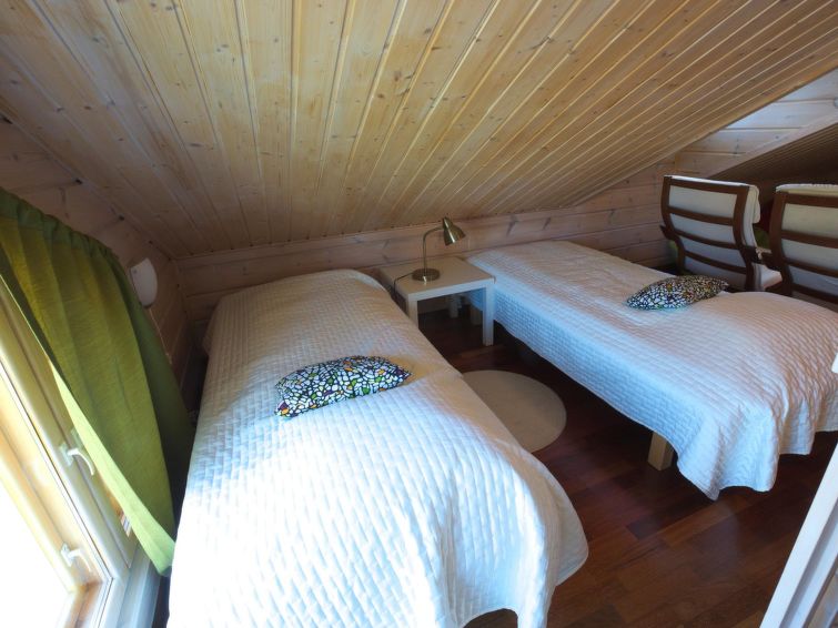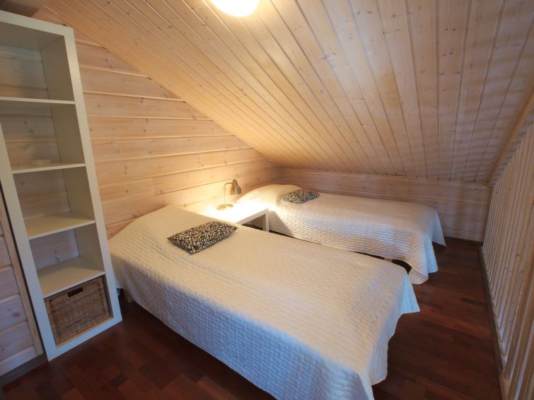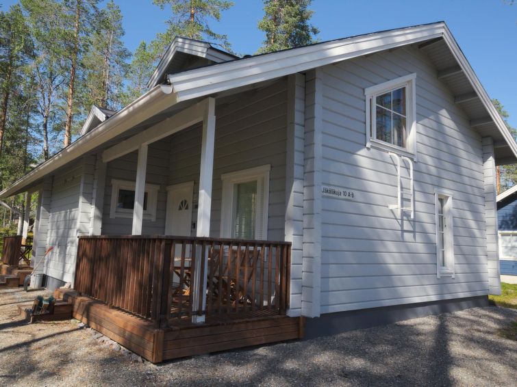 40 km north-east of Kolari, lake Ylläsjärvi 4 km, swimming beach 4,5 km. Log duplex apartment, built 2009. Livingroom/kitchen, one bedroom with doublebed, loft with 4 separate beds, electric sauna, shower/toilet (sauna and bathroom renovated in 2023).
