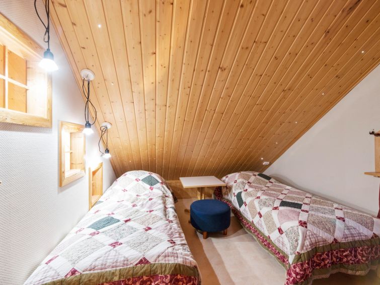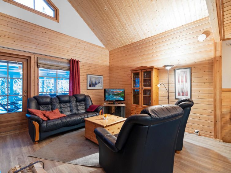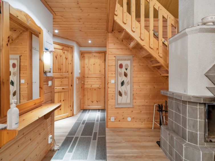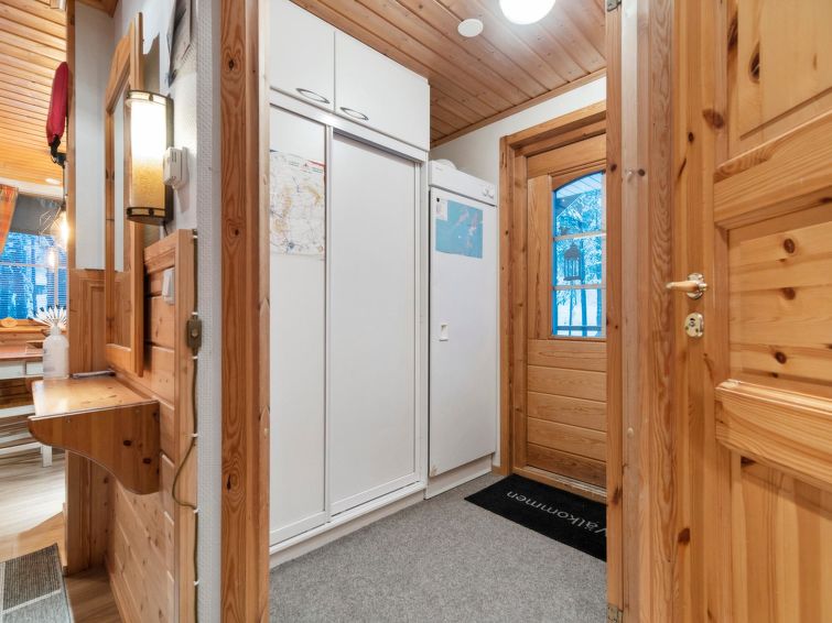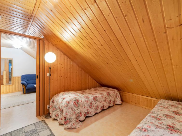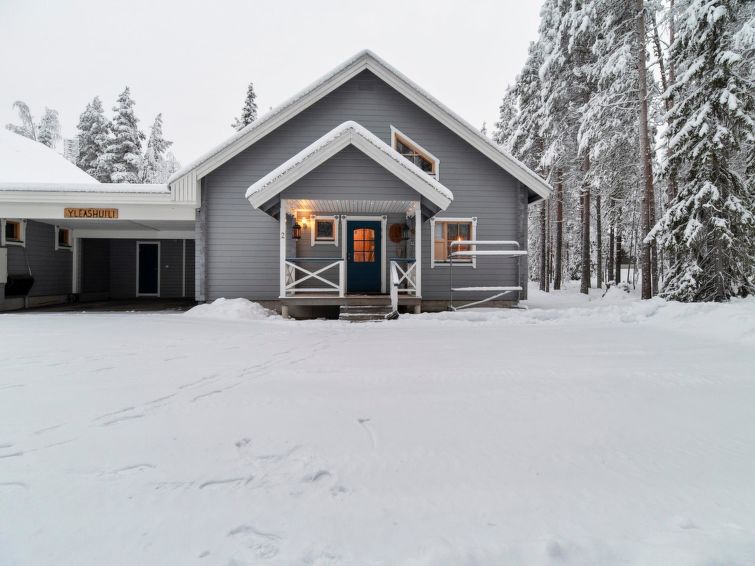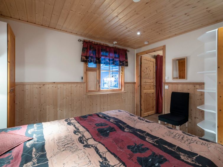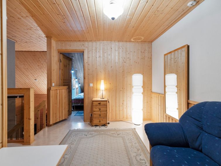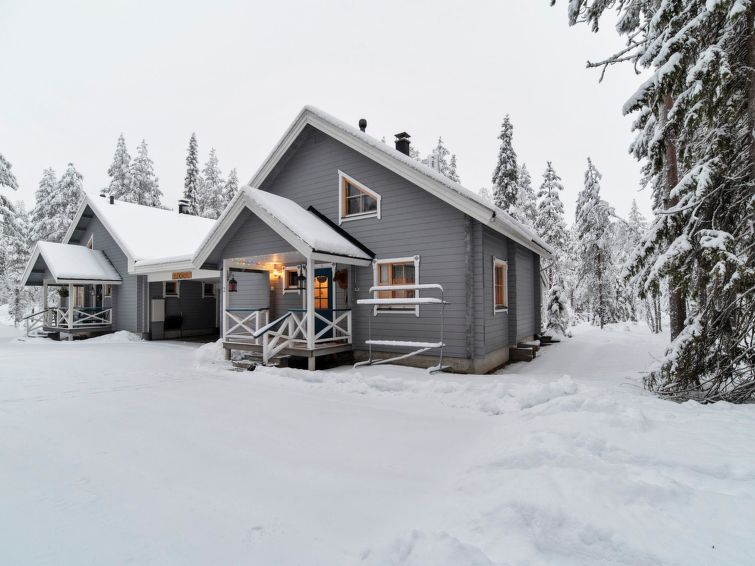 A semi-detached log house located 175 km north of Rovaniemi, in Palovaara Ylläsjärvi. Built 2003. A carport between the houses. Kitchen, living room, 3 x bedroom (1 downstairs, 2 upstairs, one with sliding door) one double bed, 4 single beds, upstairs 2 mattresses in open scape, electric sauna, washing room, 2 x toilet. Area 90 m² of which 26 m² upstairs. Car shelter between 2 cottages.