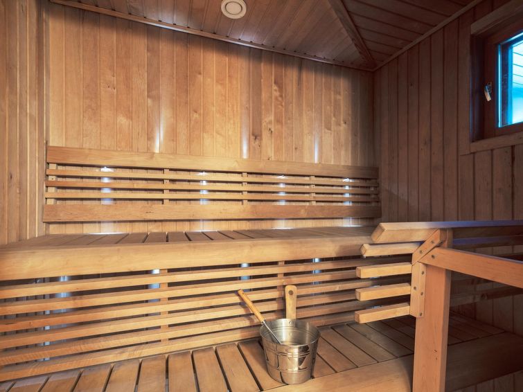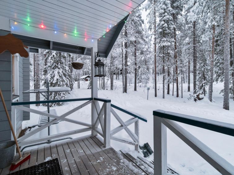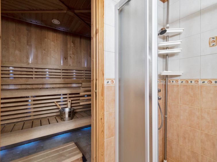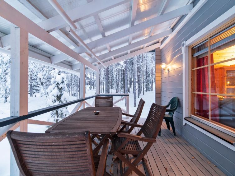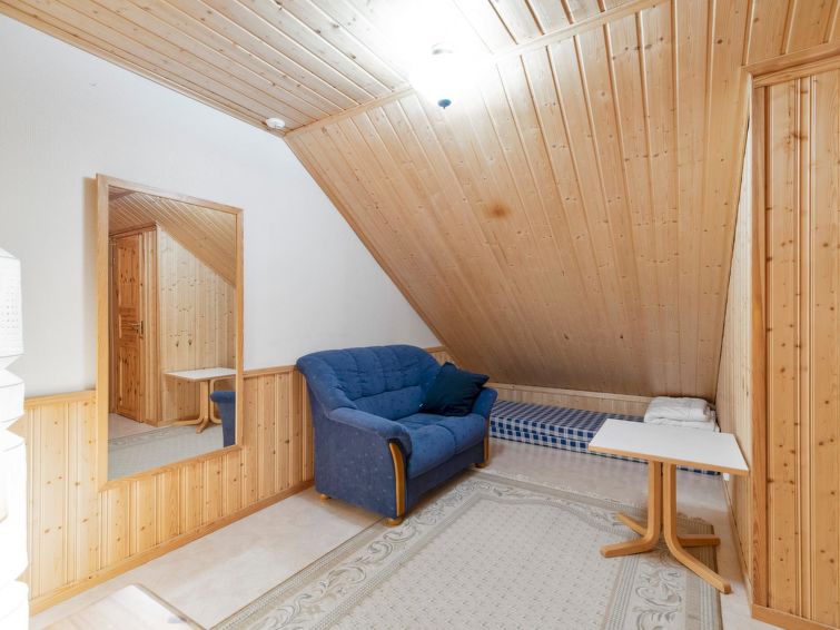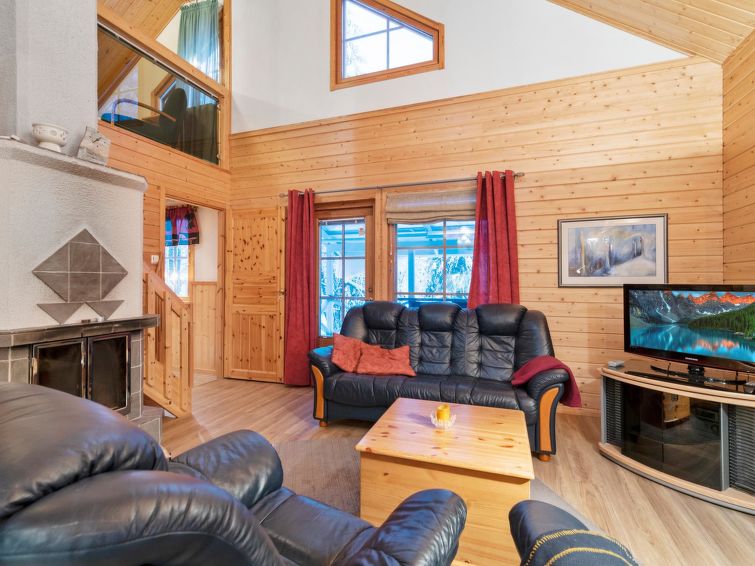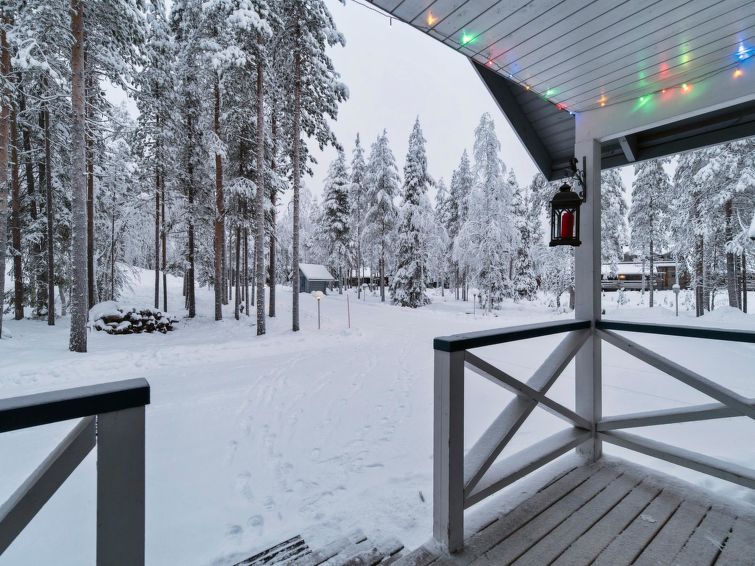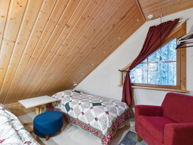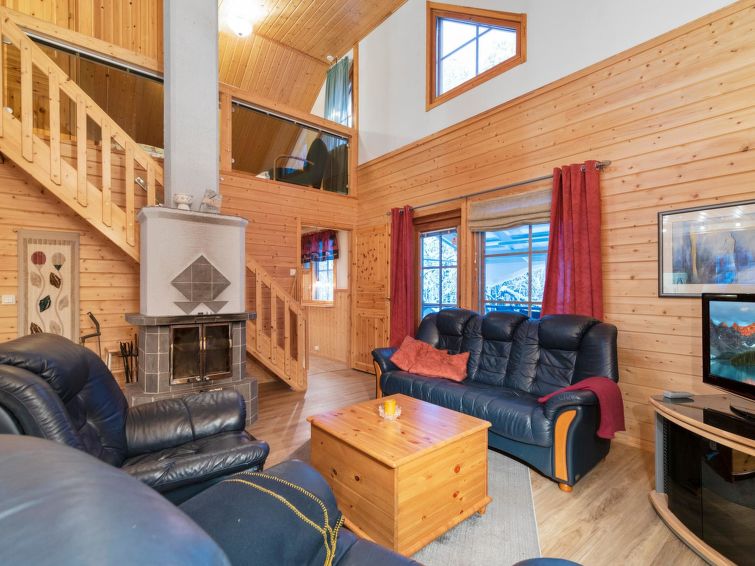A semi-detached log house located 175 km north of Rovaniemi, in Palovaara Ylläsjärvi. Built 2003. A carport between the houses. Kitchen, living room, 3 x bedroom (1 downstairs, 2 upstairs, one with sliding door) one double bed, 4 single beds, upstairs 2 mattresses in open scape, electric sauna, washing room, 2 x toilet. Area 90 m² of which 26 m² upstairs. Car shelter between 2 cottages.