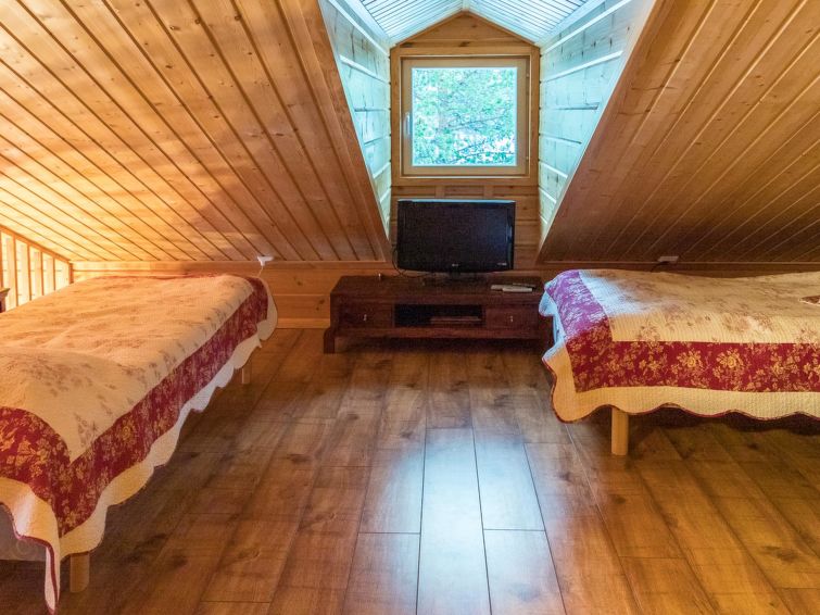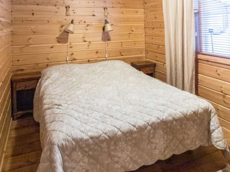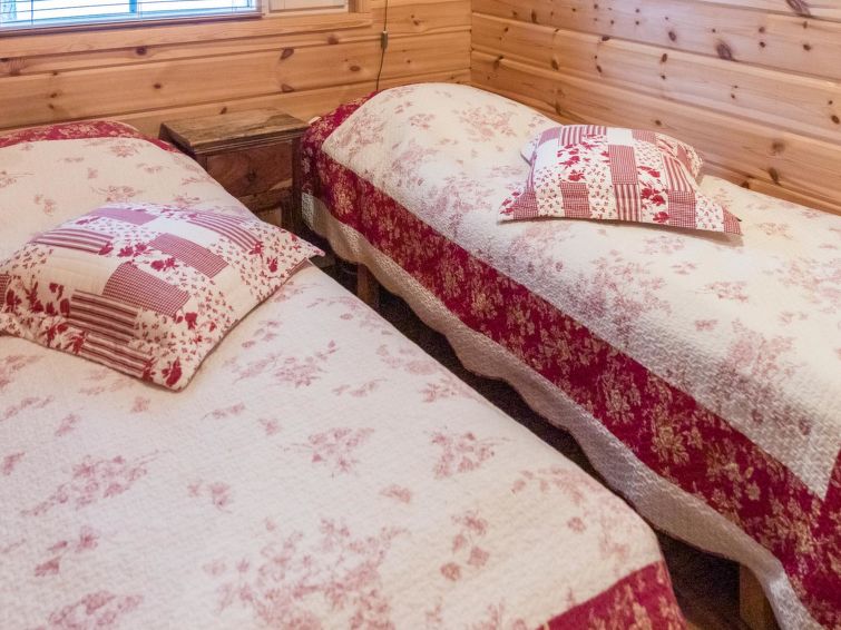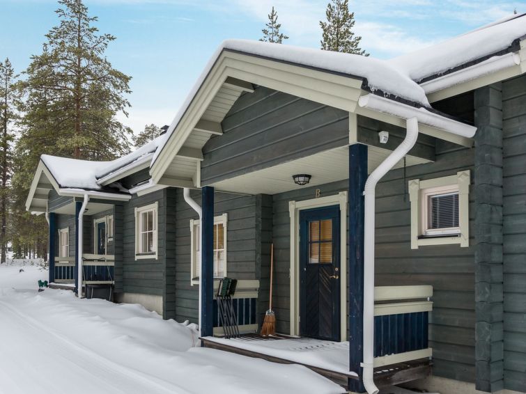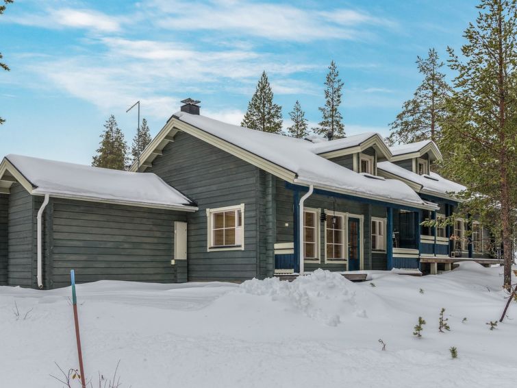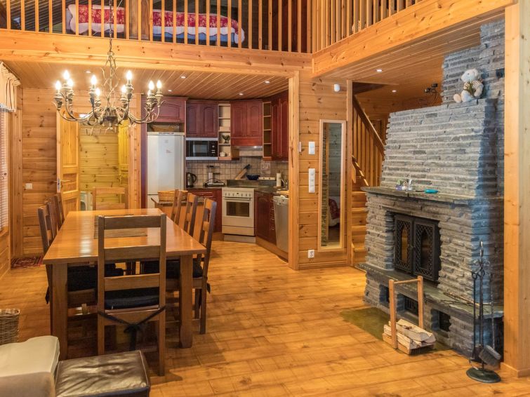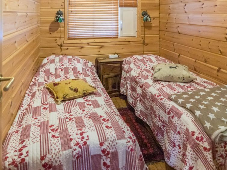 40 km north of Kolari, lake Äkäslompolo 1.7 km, swimming beach 4 km. Log semi-detached house apartment built 2006. Kitchen-living room, 3 bedrooms, one with a double bed, two with 2 single beds, a loft (20m²) with 4 twin beds, a loft with a toilet, a separate toilet downstairs, washroom, sauna (electric). Ski maintenance room, wifi A good quality comfortable cottage in Äkäslompolo village, Kaulavaara area. Apartment located in quiet, neat cottage area very close to the tracks. Pets allowed. The price includes final cleaning, bed linen available for rent.