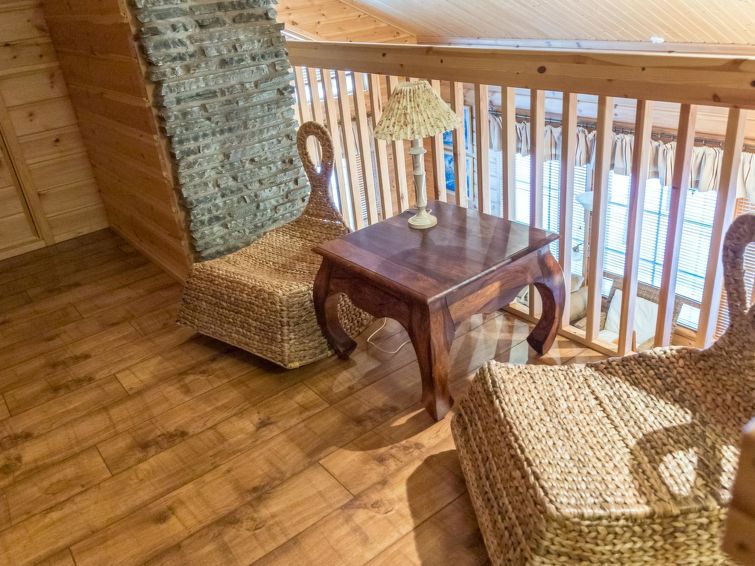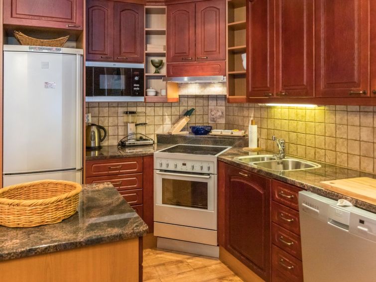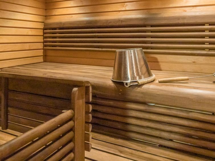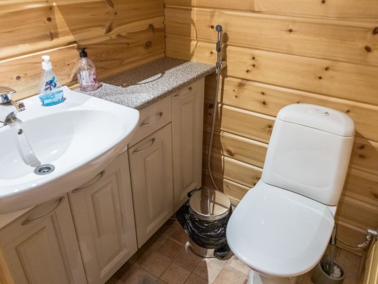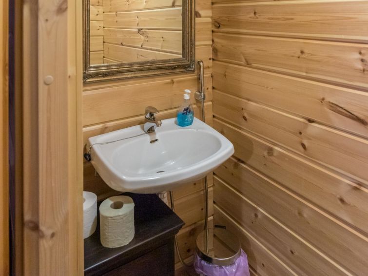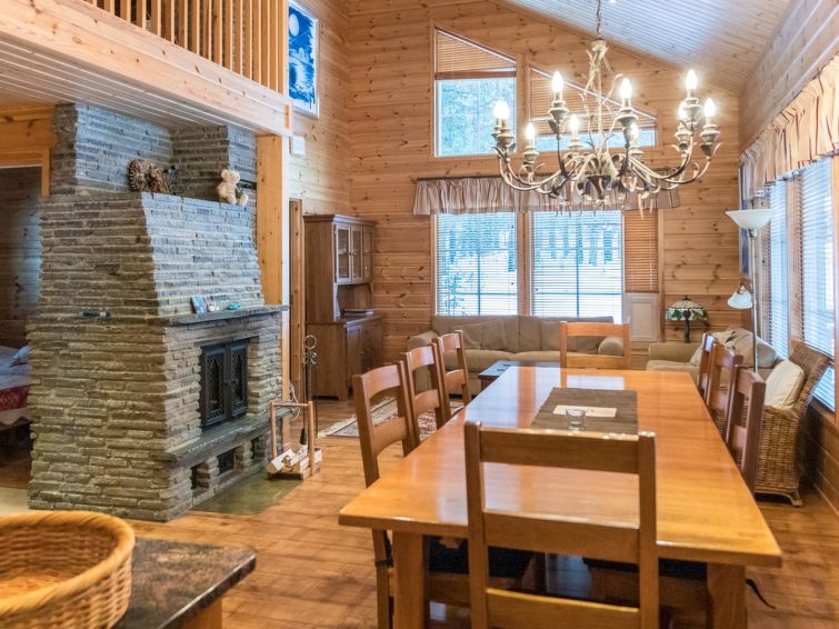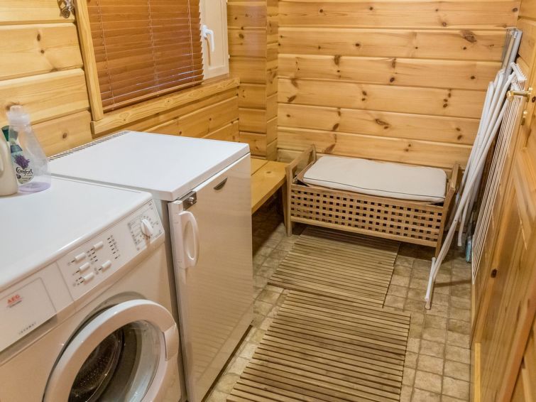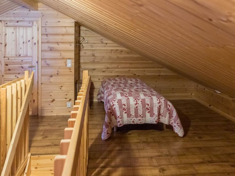 40 km north of Kolari, lake Äkäslompolo 1.7 km, swimming beach 4 km. Log semi-detached house apartment built 2006. Kitchen-living room, 3 bedrooms, one with a double bed, two with 2 single beds, a loft (20m²) with 4 twin beds, a loft with a toilet, a separate toilet downstairs, washroom, sauna (electric). Ski maintenance room, wifi A good quality comfortable cottage in Äkäslompolo village, Kaulavaara area. Apartment located in quiet, neat cottage area very close to the tracks. Pets allowed. The price includes final cleaning, bed linen available for rent.