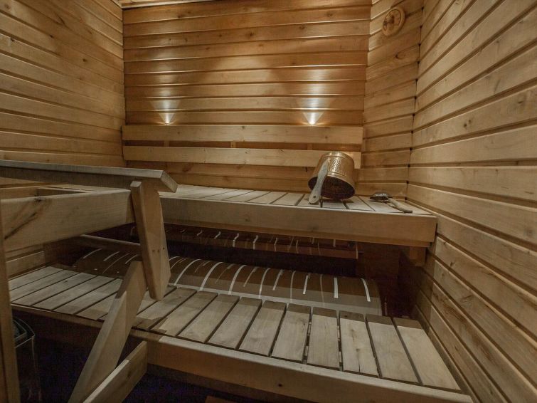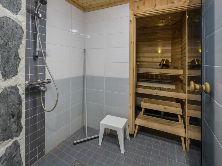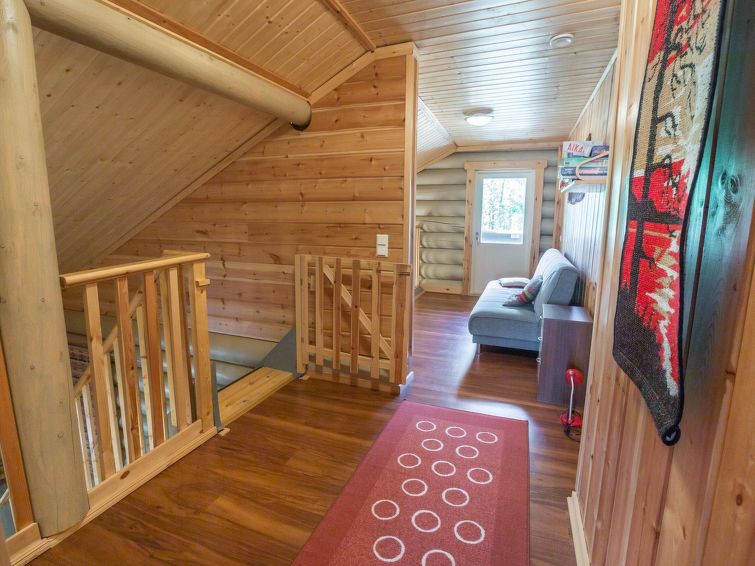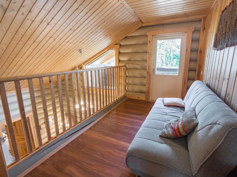 40 km north-east of Kolari, lake Ylläsjärvi 3 km, swimming beach 4,5 km. Log duplex apartment. Area 100 m² of which 30 m² on the loft. Livingroom/kitchen, two bedrooms each with two separate beds, loft with a large alcove with four beds, in loft TV for DVDs. Electric sauna, shower, separate toilet. Two porch, Wifi