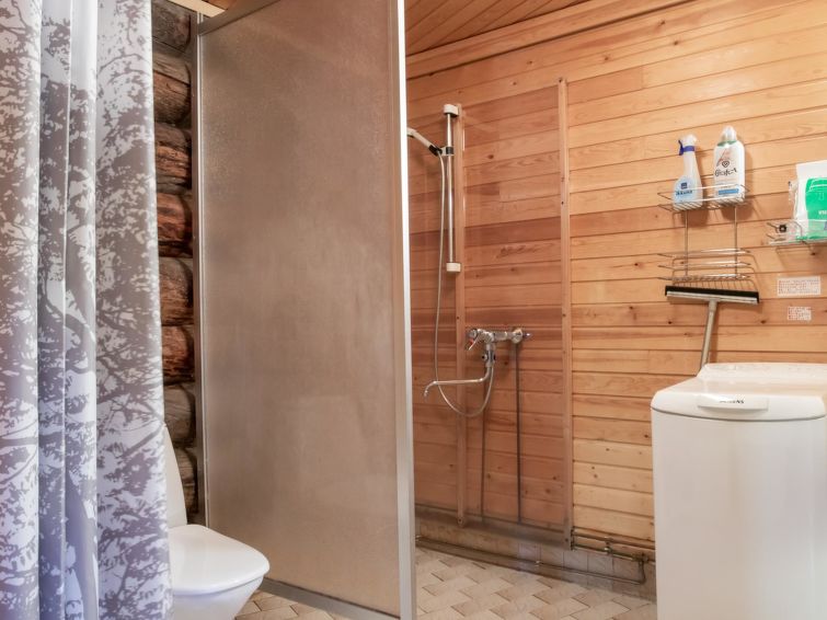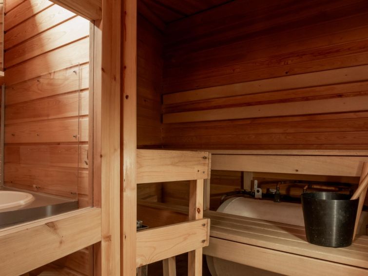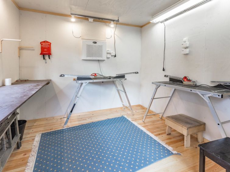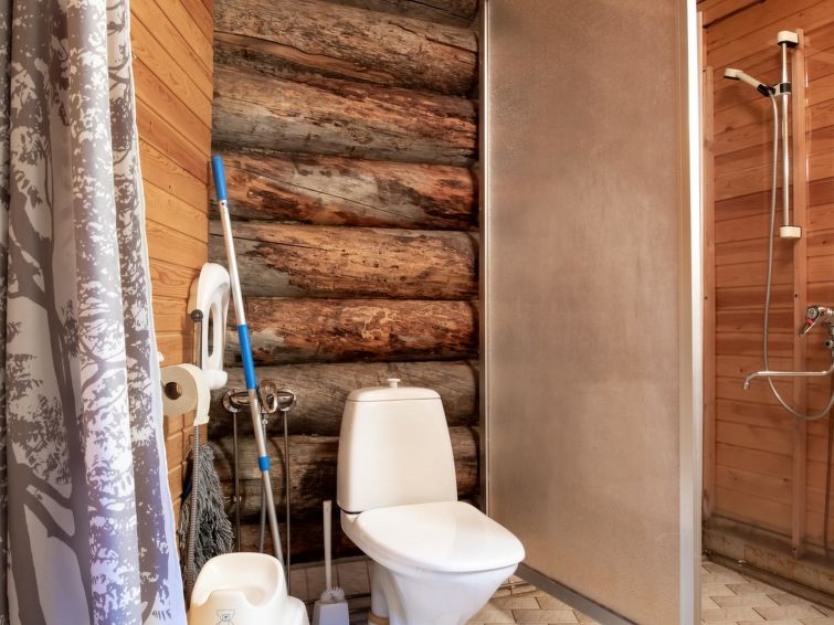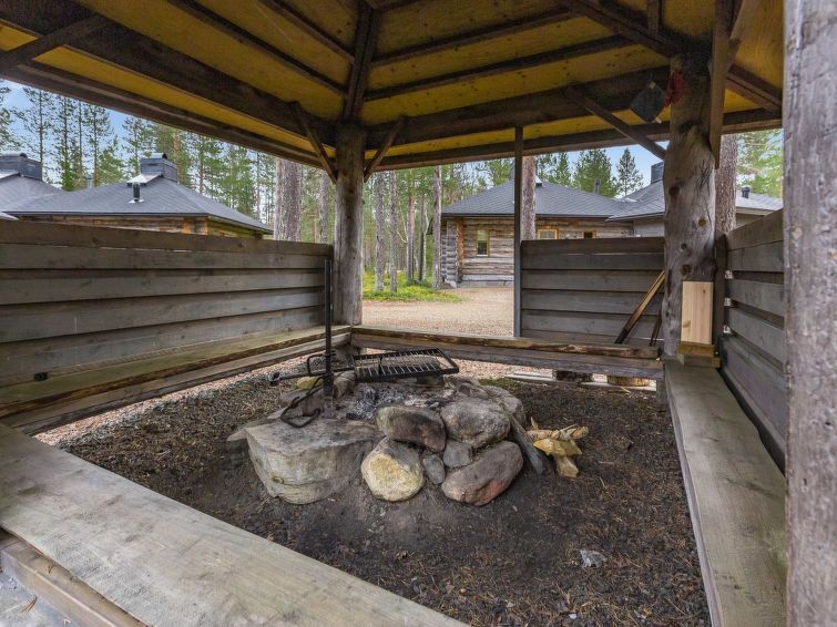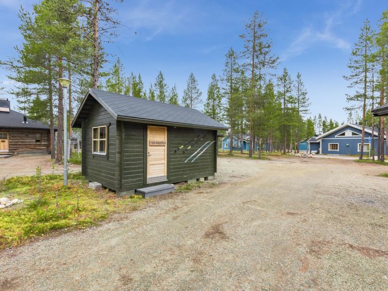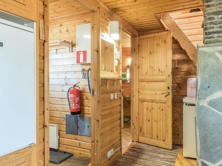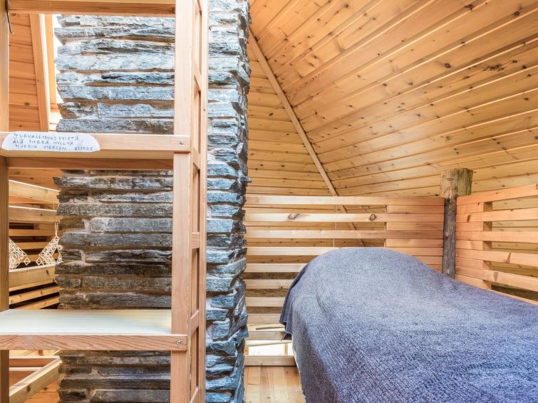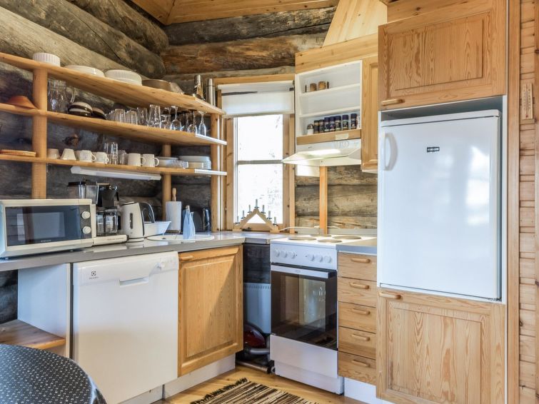 A log duplex apartment located 165 km north of Rovaniemi, in Ylinen Palovaara Ylläsjärvi. Built 1989. Combined living room kitchen, alcove 2 beds (curtain at the doorway), loft (floor area 25 m², sloping ceilings) 4 beds, electric sauna, washing room, storeroom, toilet. Barbecue hut in shared use. Final cleaning and firewoods for fireplace are included in the price. Pets are not allowed. Nearest skiing track (about 200 m) is illuminated.