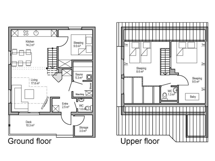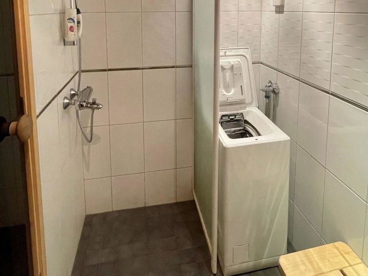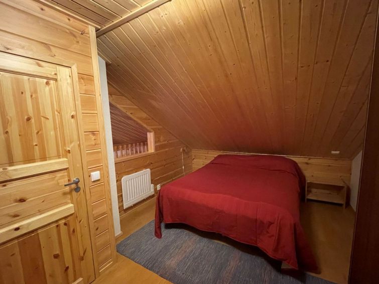 40 km north-east of Kolari, lake Ylläsjärvi 2 km, swimming beach 3,5 km. Log duplex apartment, built 2007. Livingroom/kitchen, bedroom downstairs with double bed, bedroom (with a door, but no window) upstairs with 2 beds and loft with two beds. Electric sauna, shower, separate toilet. Toilet also upstairs. Downstairs 50 m² and upstairs 20 m².