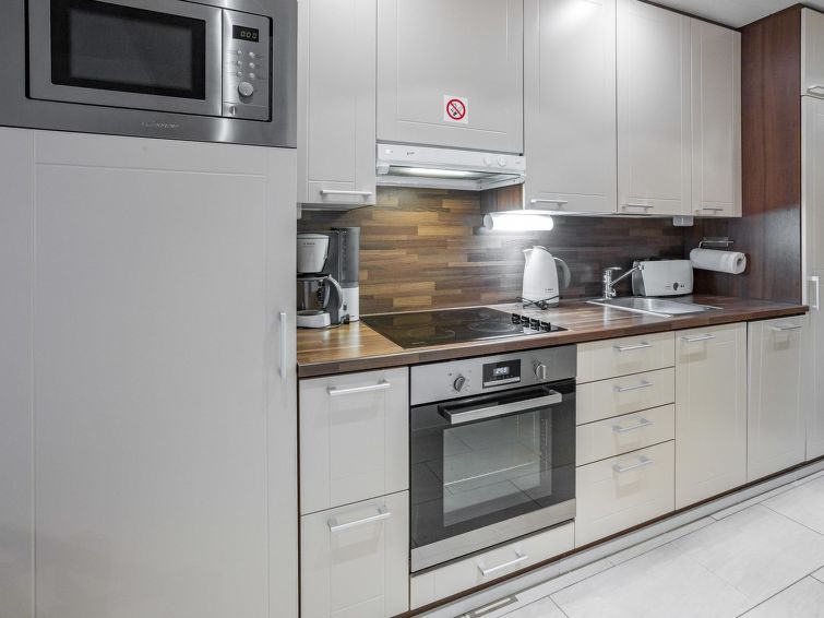 40km north of Kolari, lake Äkäslompolojärvi 1 km, beach 1,5 km. Holiday apartment on a top floor of 2-storey building, built in 2010. Combined kitchen-livingroom with convertible sofa bed, small bedroom with 2 beds, electric sauna, shower/toilet. Laundry room and ski maintenance room in shared use with all guests of Yllästar 3.
