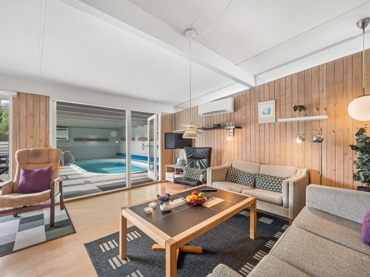 Enmannsbolig, bygget i 1970. 800 m fra sjøen. Privat: uberørt tomt 1'200 m2, innendørs pool (3 x 6 m, 18 m2, dybde 120- 120 cm dyp). Terrasse (20 m2), lekeplass. I huset: badstu, vaskemaskin. Parkering ved hbrukt. Daglivarehandel 3 km.