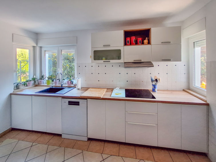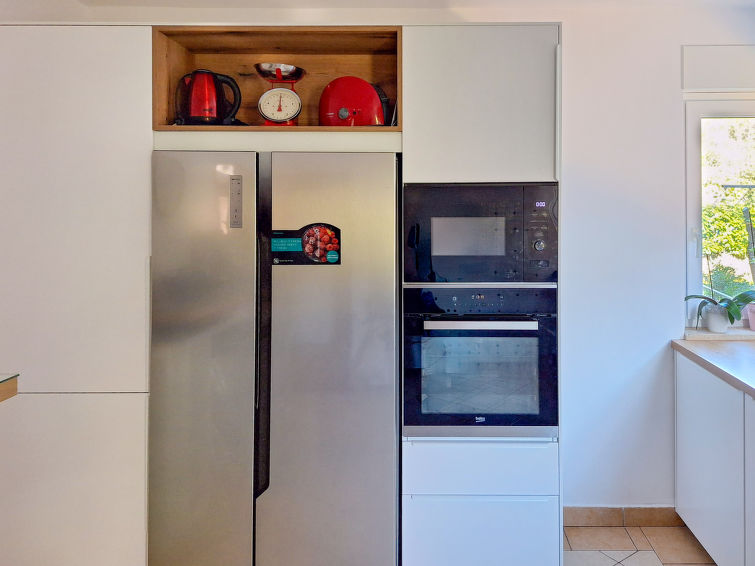 5 rom halvpart av tomannsbolig 170 m2 på 2 etasjer. Stue 25 m2 med, satelit-TV (flatskjerms TV). 1 rom med, 1 dobbeltseng (160 cm, lengde 200 cm), dusj/WC. Utgang til terrassen. 1 rom med, 1 dobbeltseng (2 x 90 cm, lengde 200 cm). Utgang til terrassen. 1 rom med, 1 dobbeltseng (160 cm, lengde 200 cm). 1 rom med, 1 dobbeltseng (2 x 90 cm, lengde 200 cm). Bad/WC, dusj/WC. I underetasje: spisestue. Utgang til terrassen. Kjøkken (4 kokeplater, stekeovn, oppvaskmaskin, mikrobølgeovn, frys, elektrisk kaffemaskin). Sep. WC. Oppvarmingsalternativ. Terrasse 30 m2, dekt terrasse 10 m2. Terrassemøbler, grill (flyttbar), liggestoler. Utsikt av svømmebassenget. Fasiliteter: høy barnestol barneseng. Internett (trådløs LAN [WLAN], gratis). 1 lite kjæledyr / liten hund tillatt.